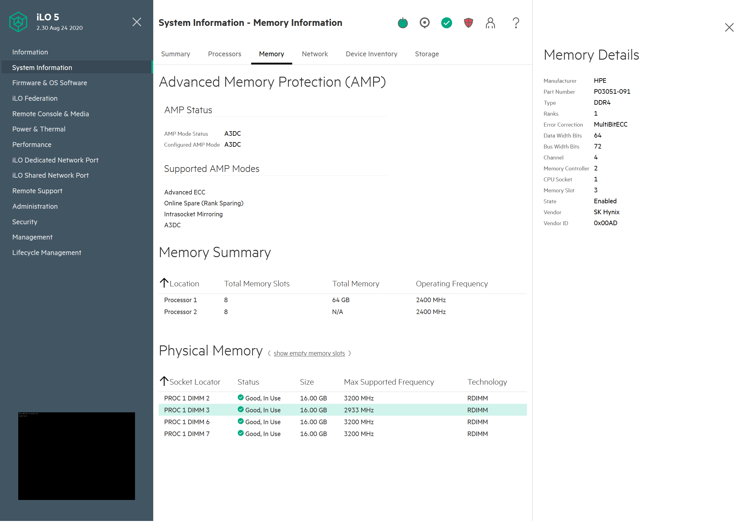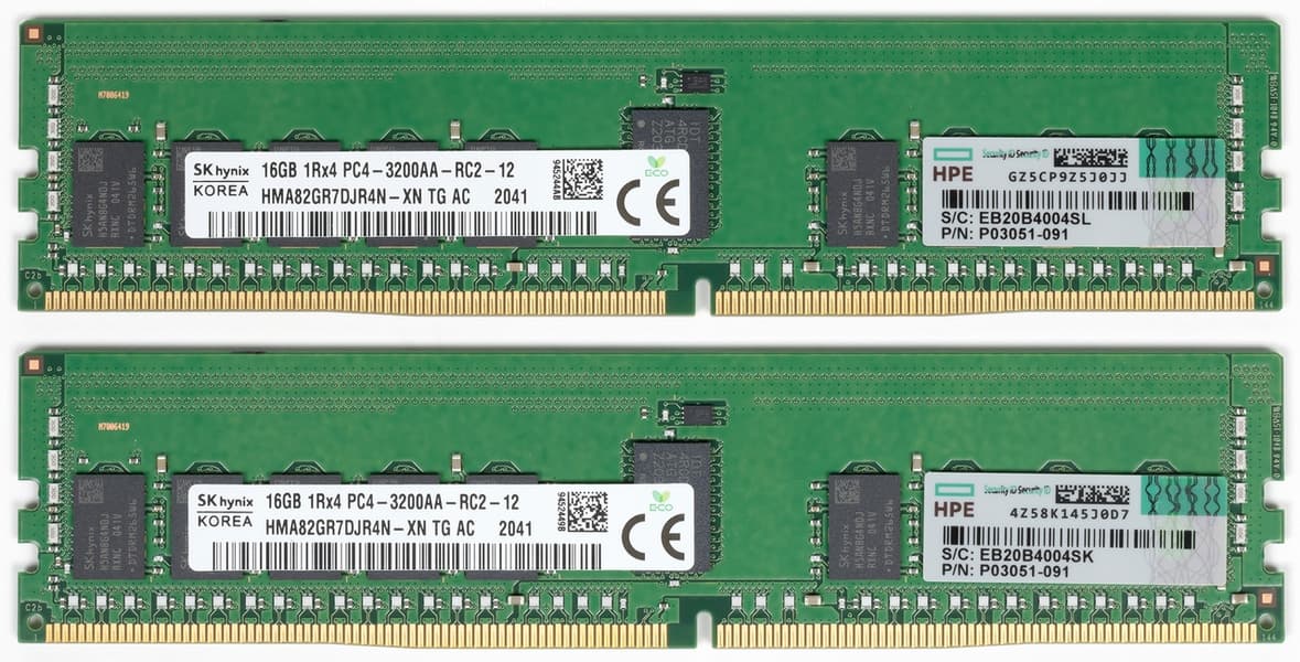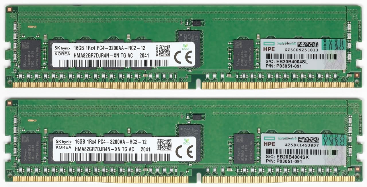 Сервер имеет по восемь слотов для оперативной памяти на каждый из двух процессорных сокетов. В нашем случае с одним процессором было установлено четыре модуля по 16 ГБ. Использовались брендированные под HPE модули Hynix HMA82GR7DJR4N-XN — регистровые ECC DDR4-3200 (PC4-25600R) RDIMM. Максимально в сервере можно установить 1 ТБ оперативной памяти при использовании модулей по 64 ГБ. Что касается частоты работы оперативной памяти, то максимальная зависит от процессоров. В случае Xeon Silver 4210R это DDR4-2400.