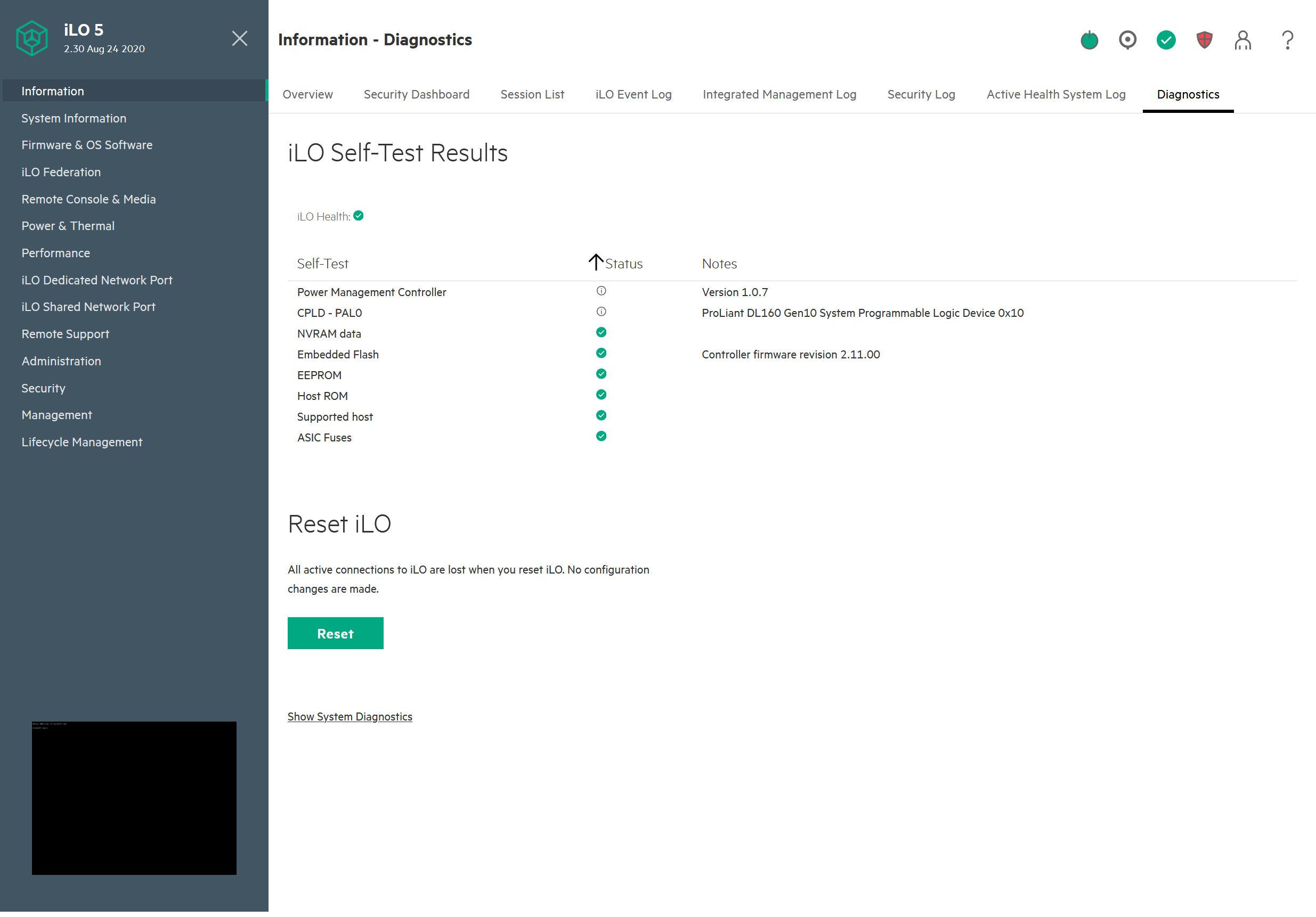 Всего в главном меню представлено четырнадцать пунктов. Information предоставляет основную информацию о сервере, список текущих подключений, несколько журналов событий (в том числе самого iLO, системный, безопасности), суммарные результаты встроенной диагностики.