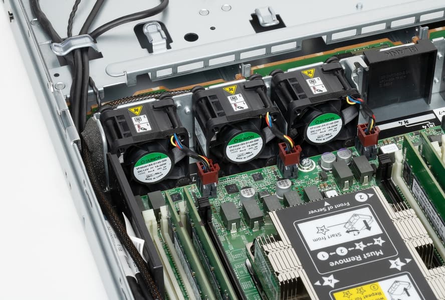Охлаждение системы осуществляется с использованием вентиляторов Sunon VF40281BX-D140-Q9I формата 40×28 мм. Они установлены в специальных отсеках между блоком накопителей и материнской платой через резиновые вставки. В случае комплектации одним процессором мы видим только три вентилятора. При установке двух процессоров и/или дополнительных контроллеров, можно добавить еще до четырех вентиляторов, заменив на них штатные заглушки.