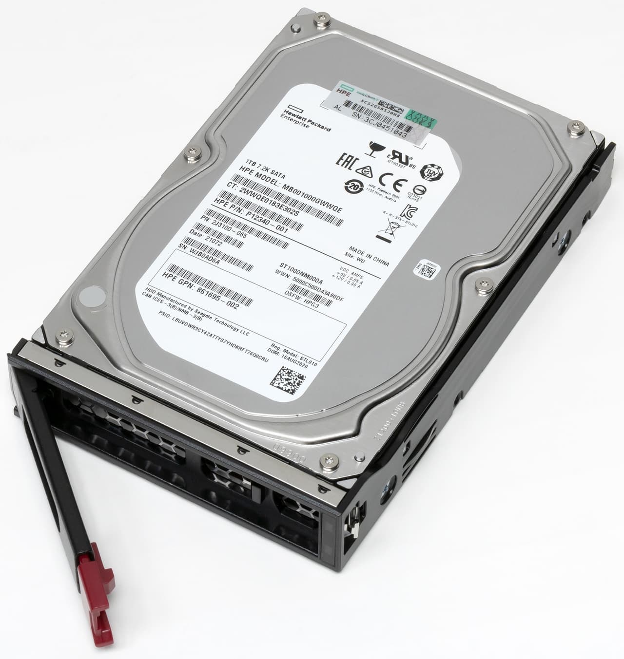 Поскольку производитель в качестве официальных запасных частей поставляет сразу диски на салазках (в нашем случае это был артикул HP 862130-B21, что соответствует «1 ТБ SATA 7200 RPM» без уточнения конкретного производителя и модели винчестера), то даже ничего не нужно делать отверткой. Следствием этого является то, что в случае базовой комплектации менее чем четырьмя дисками, в оставшиеся отсеки будут установлены заглушки, а не полноценные салазки.