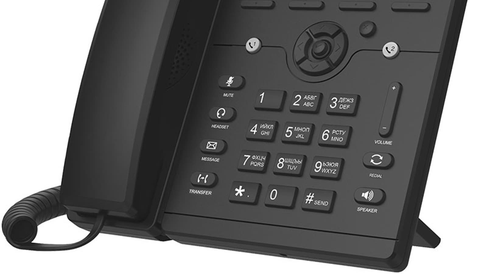Верхняя панель зрительно состоит из трех частей: площадки для трубки с динамиком спикерфона в центре, дисплейно-навигационной секции и наборного блока с буквенно-цифровыми клавишами. Все кнопки и клавиши телефона имеют одинаково мягкий и короткий ход без щелчков.