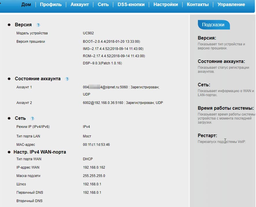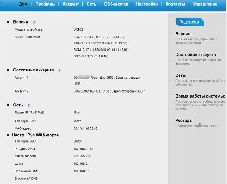 Главная страница веб-интерфейса телефона отображает информацию о версии прошивки аппарата, текущем состоянии подключенных аккаунтов и настройках сети, а также показывает время непрерывной работы системы.