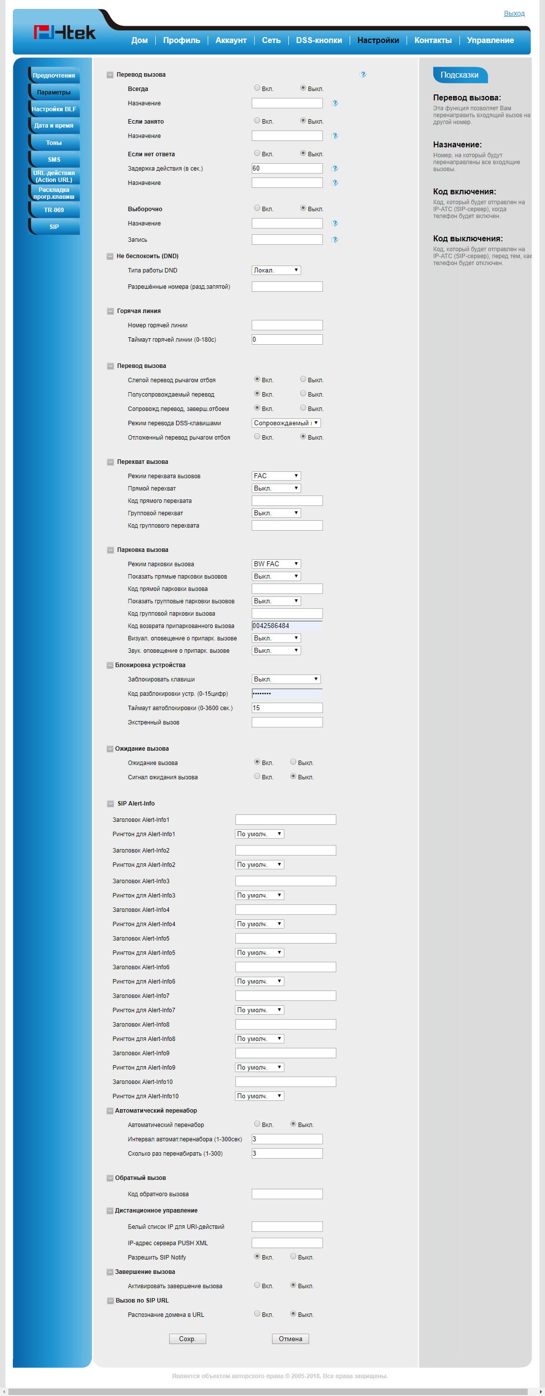 Здесь правила перевода, перехвата и парковки вызовов соседствуют с параметрами дополнительной информации Alert-Info. Опытный администратор знает, что на данной странице фактически приведена часть функциональности, имеющейся в VoIP-платформе Asterisk. Оказывается, скромный телефонный аппарат начального уровня содержит в себе немало сюрпризов.