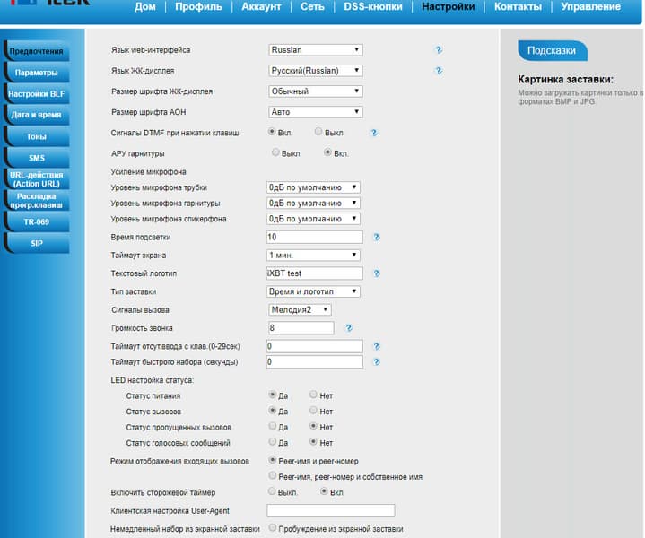 Прочие настройки позволяют включить отображение пропущенных вызовов, настроить таймеры сигнала занятости и автовыхода из учетной записи, ввести адрес сервера фотографий контактов, отрегулировать порядок набора и добавить на дисплей телефона свой текстовый логотип. Что мы и сделали.