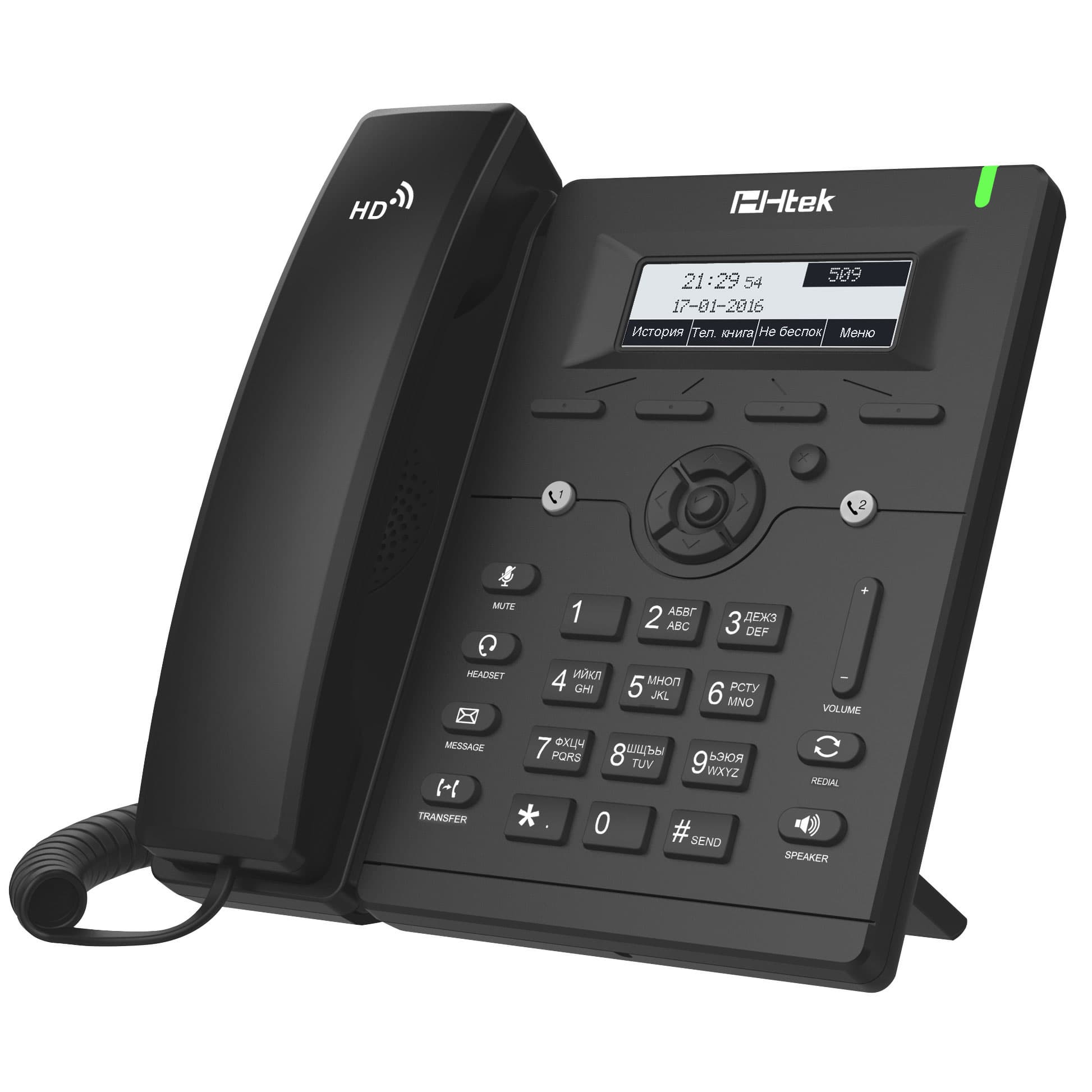 Через минуту после включения телефона он полностью готов к работе, о чем сигнализирует ровным зеленым цветом главного индикатора. За время тестирования аппарат почти не выключался, играя роль «рабочей лошадки», помогающей изучать функции двух старших моделей Htek. Это помогло понять одну важную особенность модельного ряда: несмотря на разницу в конструкции и исполнении (и стоимости, разумеется!), ключевые модули и функции во всех телефонах Htek выполнены с одинаково высоким качеством.