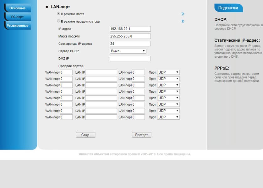 Способы подключения к сети выбираются и настраиваются в соответствующей вкладке настроек прибора. Здесь можно ввести статический IP либо оставить работающим DHCP, ввести логин/пароль для подключения по протоколу PPPoE, выбрать режим использования LAN-портов телефона (мост позволяет подключить телефонный аппарат и компьютер к одной LAN-розетке), осуществить переадресацию/проброс портов, а также изменить порты основных протоколов и стандартов, поддерживаемых аппаратом.