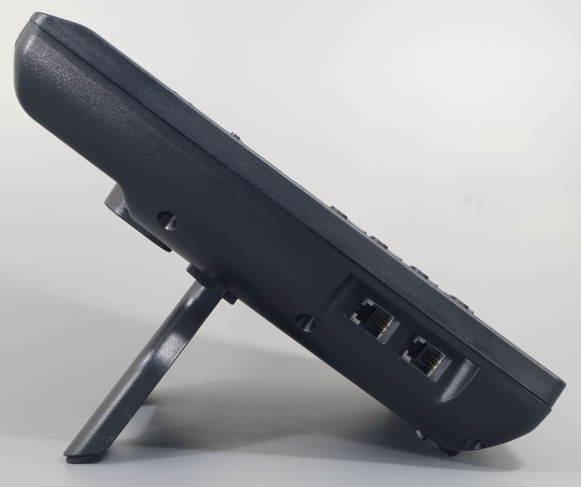 Разъемы для подключения трубки и гарнитуры выведены на левую боковую грань корпуса. Угол наклона аппарата можно уменьшить или увеличить, изменив положение подставки.