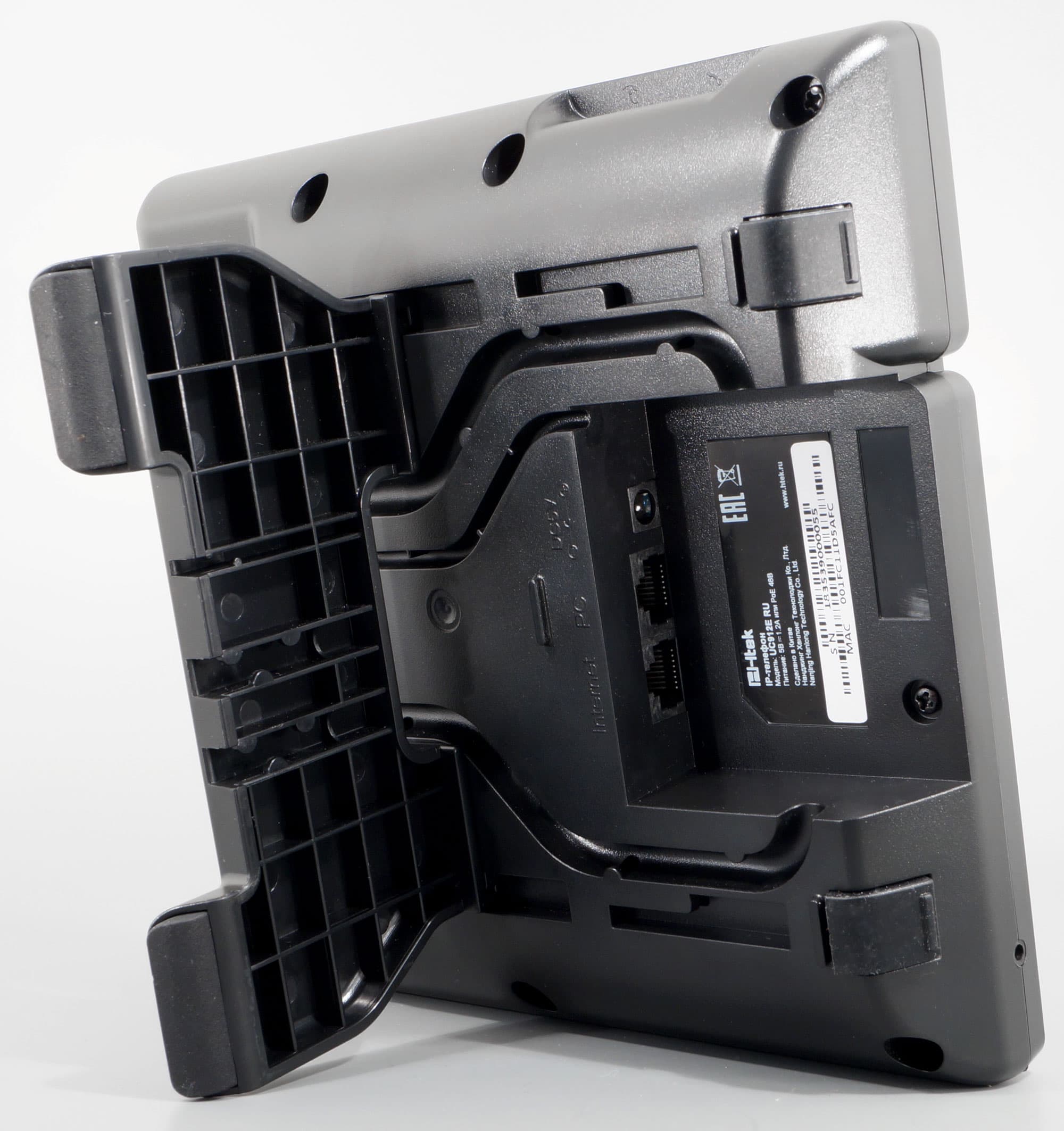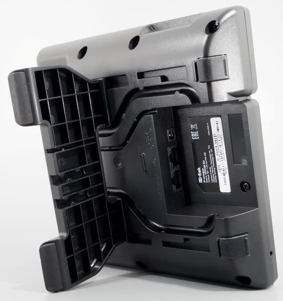 Прочие интерфейсы находятся в углублении, которое обустроено в днище корпуса: разъем питания и два Ethernet 10/100 Мбит/с, которые могут работать в режиме настраиваемого моста, позволяя подключить телефон и находящийся рядом компьютер к одной LAN-розетке. Для крепления кабелей, идущих от каждого разъема, в днище предусмотрены изогнутые канавки с фиксаторами. Они выводят провода к тыльной стороне корпуса, где торчащие хвосты никак не помешают.