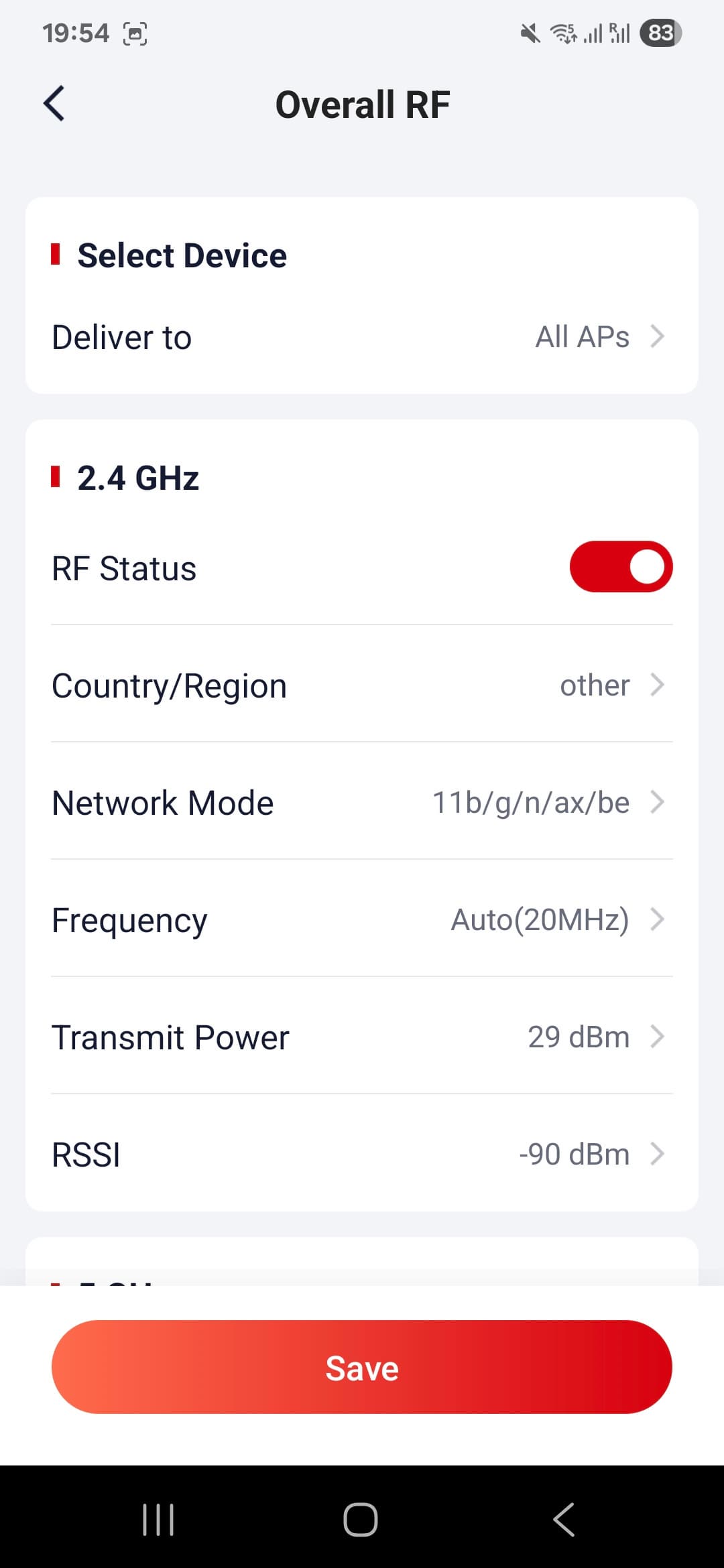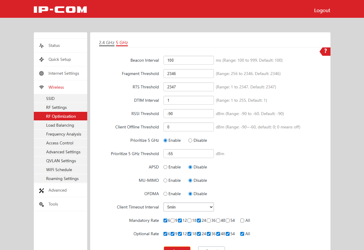 За режимы работы радиоблоков отвечает страница RF Settings. Здесь уже можно выбрать регион, максимальный стандарт Wi-Fi, номер и ширину канала, а также мощность передатчика. Более тонкие настройки радио собраны на странице RF Optimization.