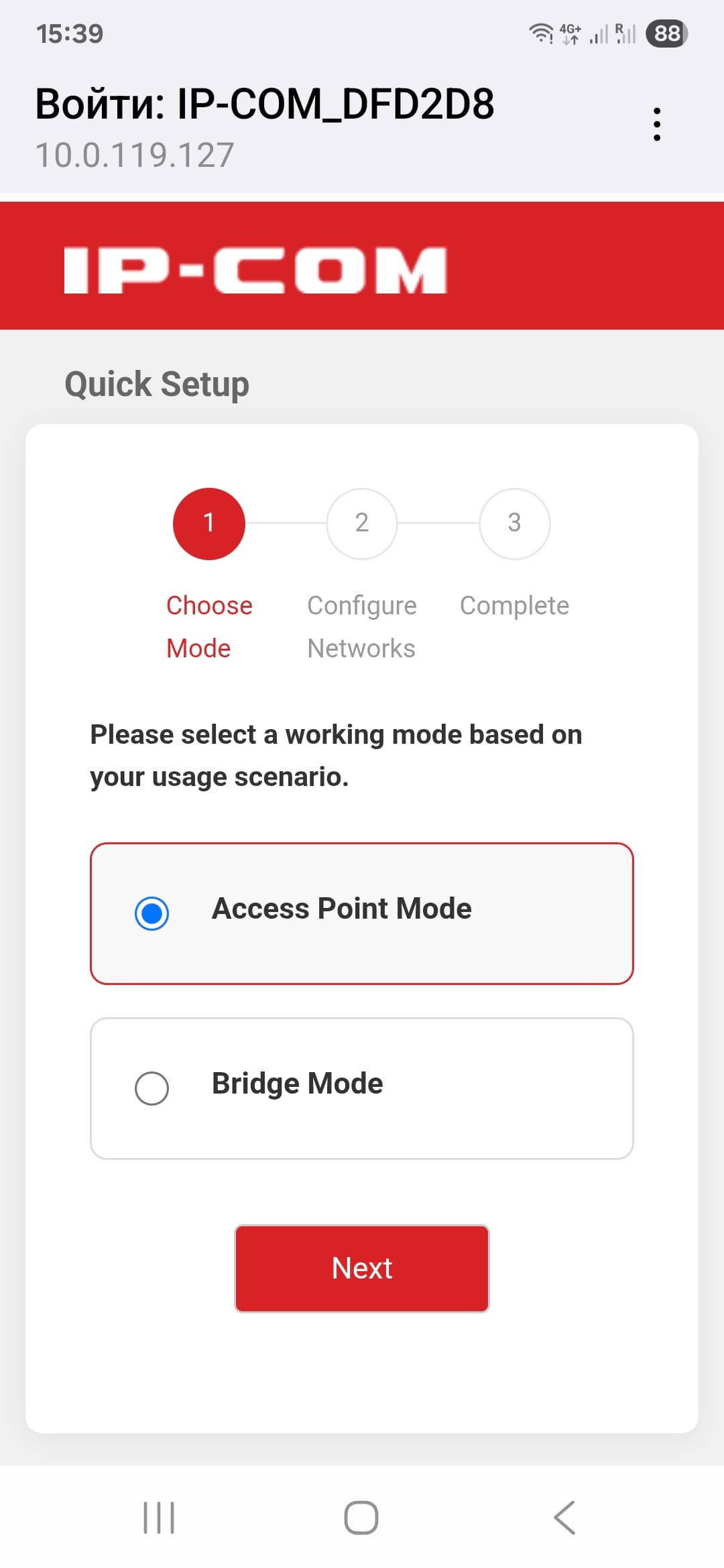 Для работы через браузер потребуется определить IP-адрес точки в локальной сети, например по логам сервера DHCP. При первом подключении будет предложено пройти мастер настройки. В нем всего два шага — на первом выбираем режим работы (точка доступа или мост), на втором указываем имя и пароль беспроводной сети, а также пароль администратора. При необходимости можно провести настройку и с беспроводного устройства, подключившись к открытой по умолчанию сети точки доступа.