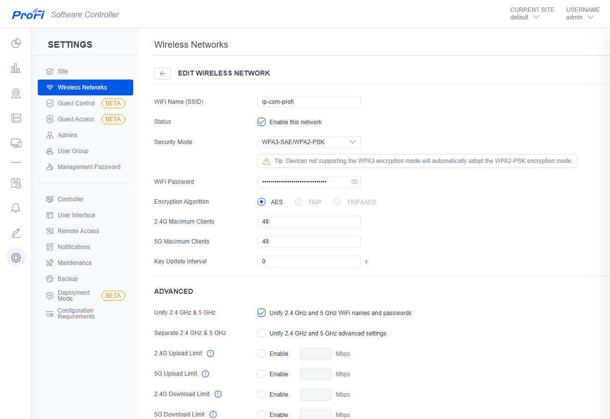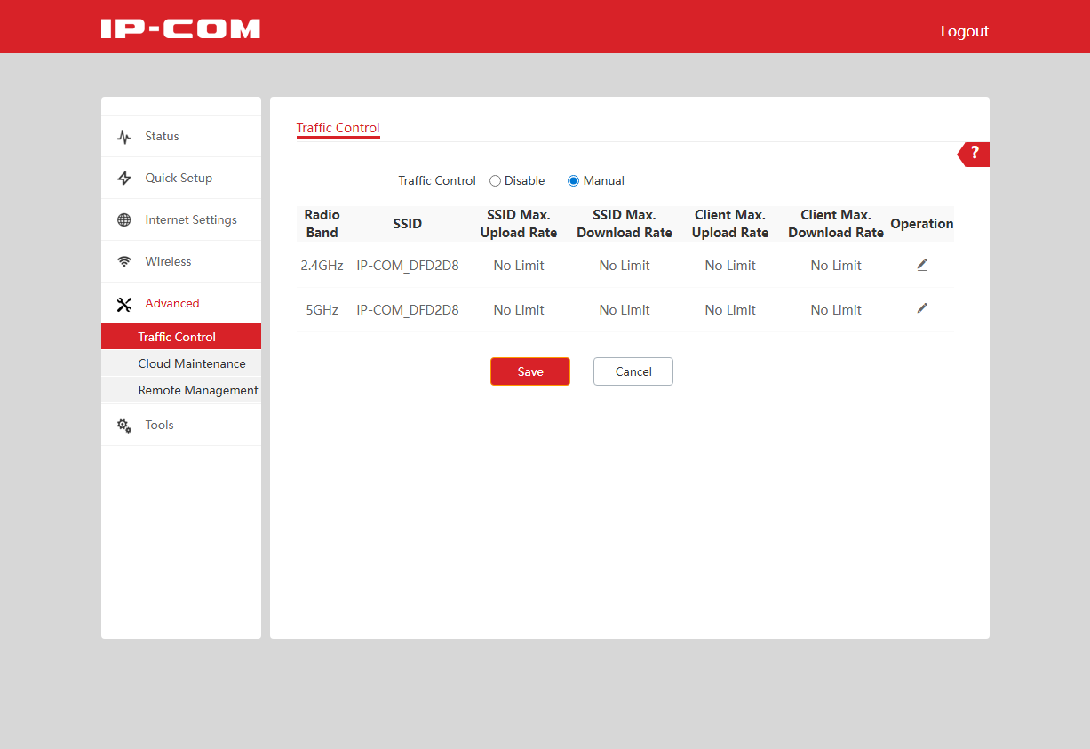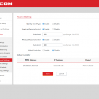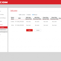 В группе Advanced есть три страницы. На Traffic Control можно настроить ограничения на скорости приема и передачи для каждого SSID и диапазона. Есть возможность установки лимитов на всю сеть или на каждого клиента.