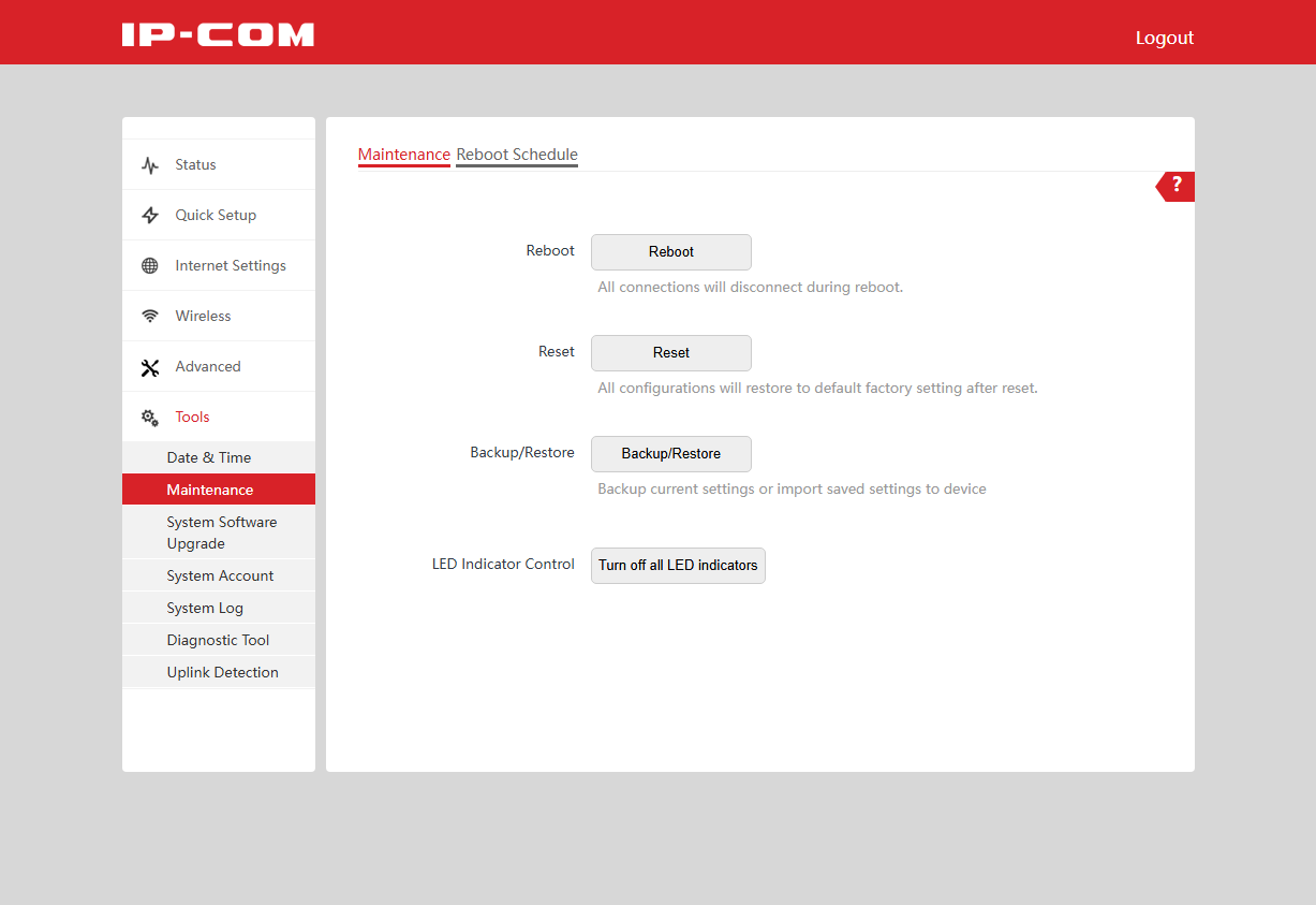 Последняя группа Tools традиционно служебная. Здесь настраивается дата и время, есть функции перезапуска (в том числе и по расписанию) и сброса, отключения индикаторов, сохранения и восстановления конфигурации, обновления прошивки (в том числе и онлайн), изменение пароля администратора, системный журнал, утилита ping для диагностики, настройка функции определения наличия подключения к интернету (ping двух внешних хостов). Кстати, интересно, что копия конфигурации создается в текстовом формате, что может быть полезно для автоматизации управления несколькими устройствами.