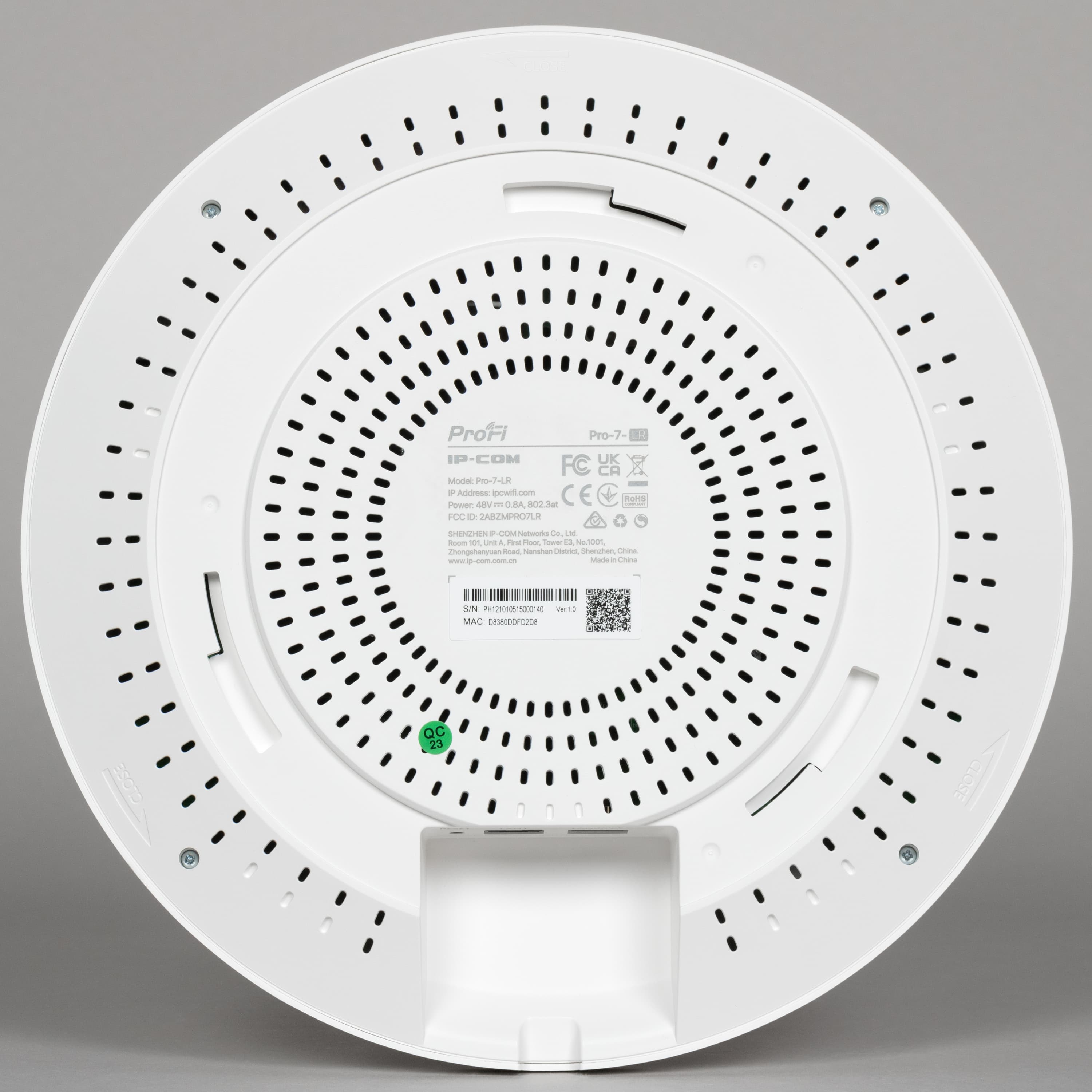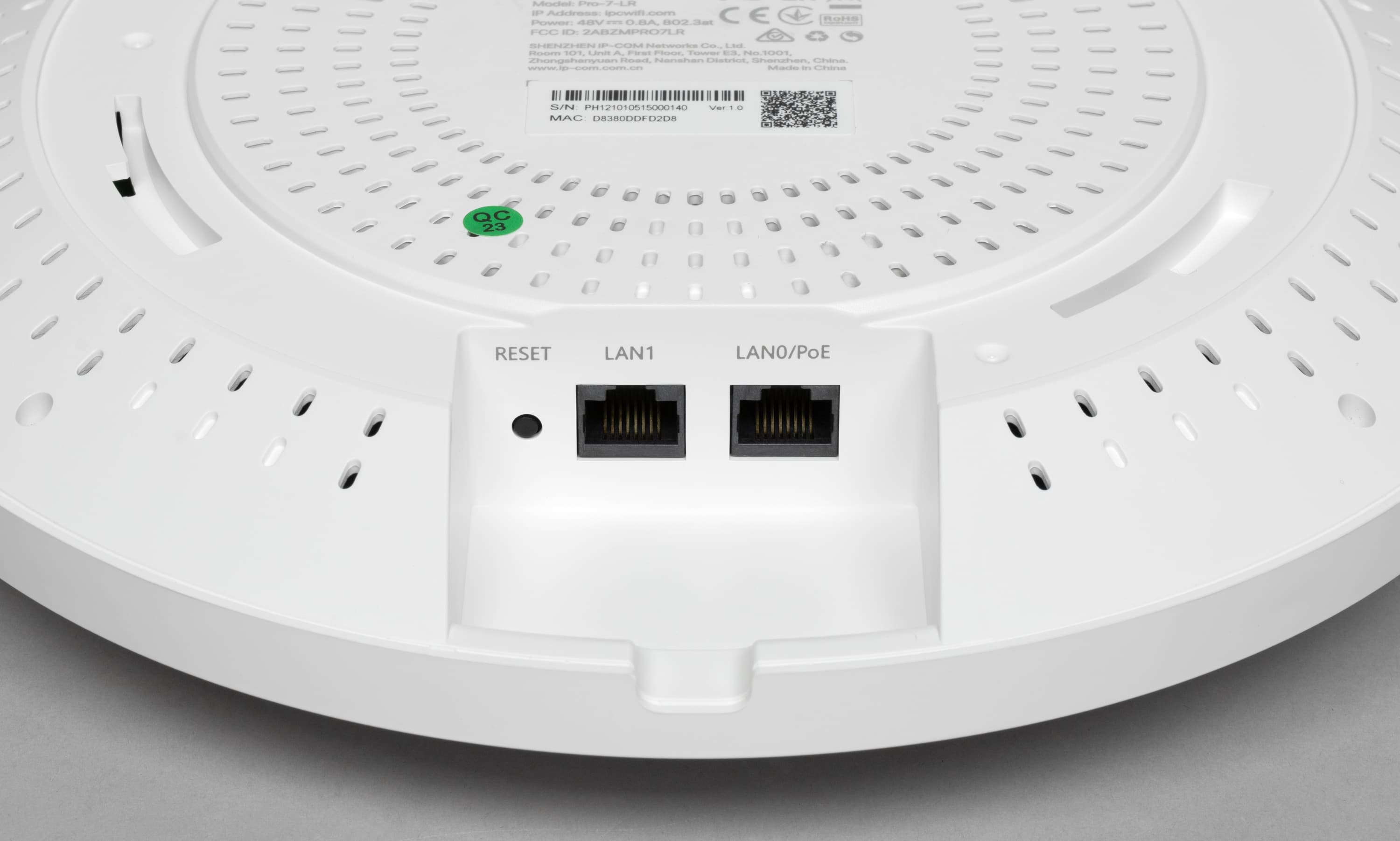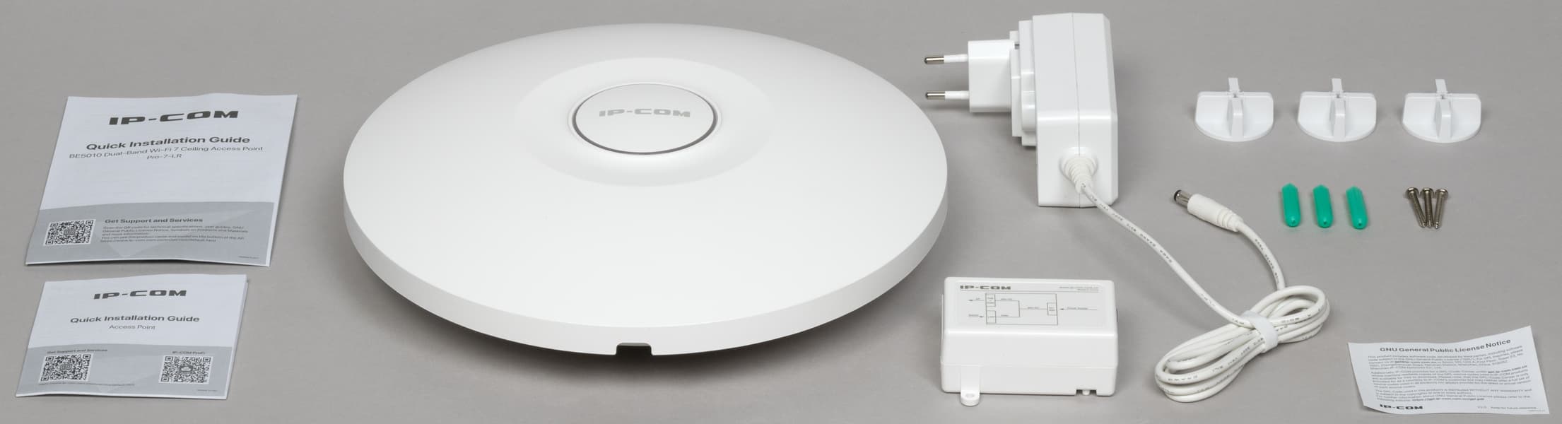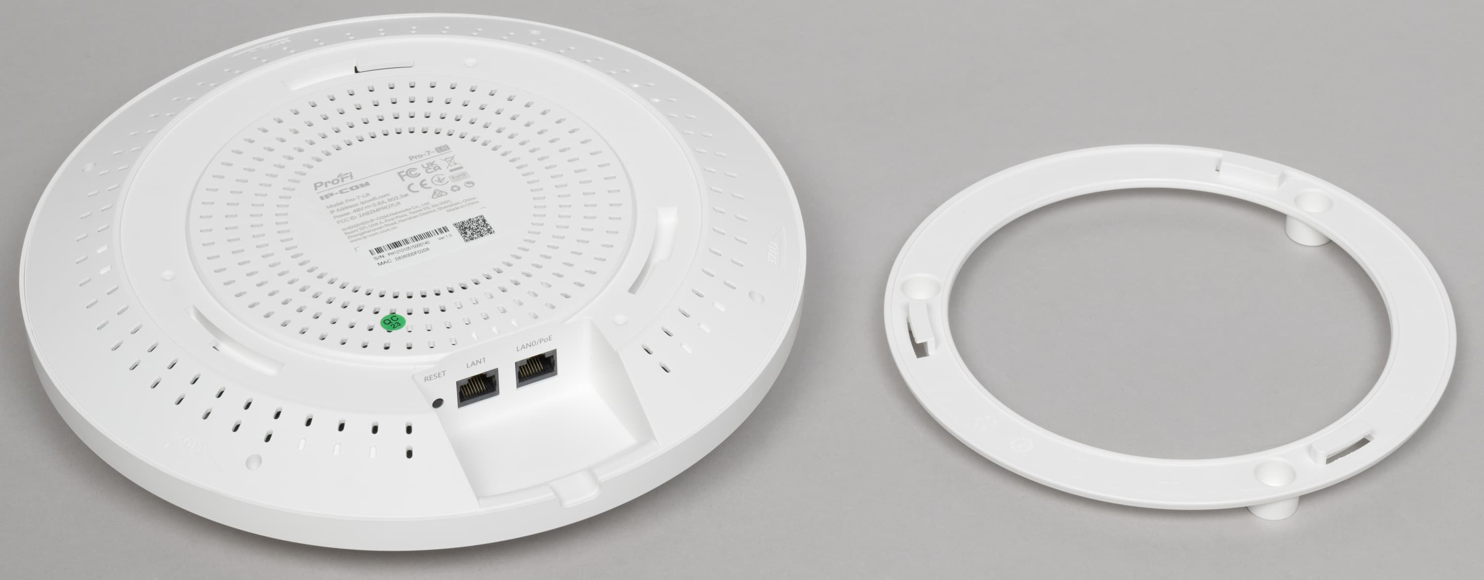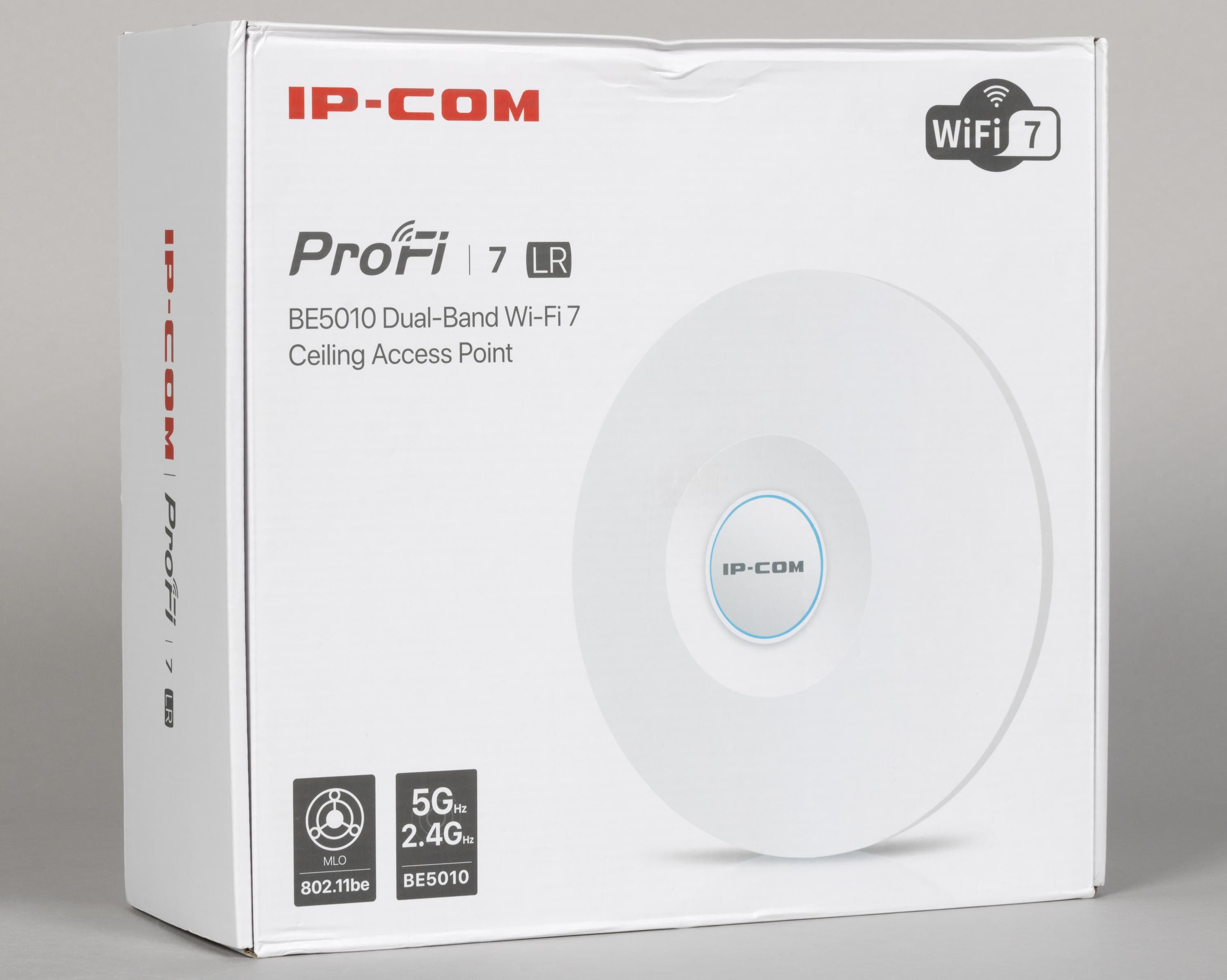 Точка доступа IP-COM Pro-7-LR выполнена в традиционном для данного сегмента формате. В комплект поставки входит всё необходимое для установки на потолок или на стену. Питание по технологии PoE также является обычным решением для точек доступа и позволяет подводить только один кабель к месту установки. Модель относится к классу BE5010 и поддерживает актуальный стандарт беспроводных сетей Wi-Fi 7, однако, в отличие от некоторых других устройств, здесь реализована работа только в диапазонах 2,4 и 5 ГГц. Для подключения к локальной сети предусмотрен порт 2,5 Гбит/с, что позволяет полноценно реализовать возможности беспроводной части.