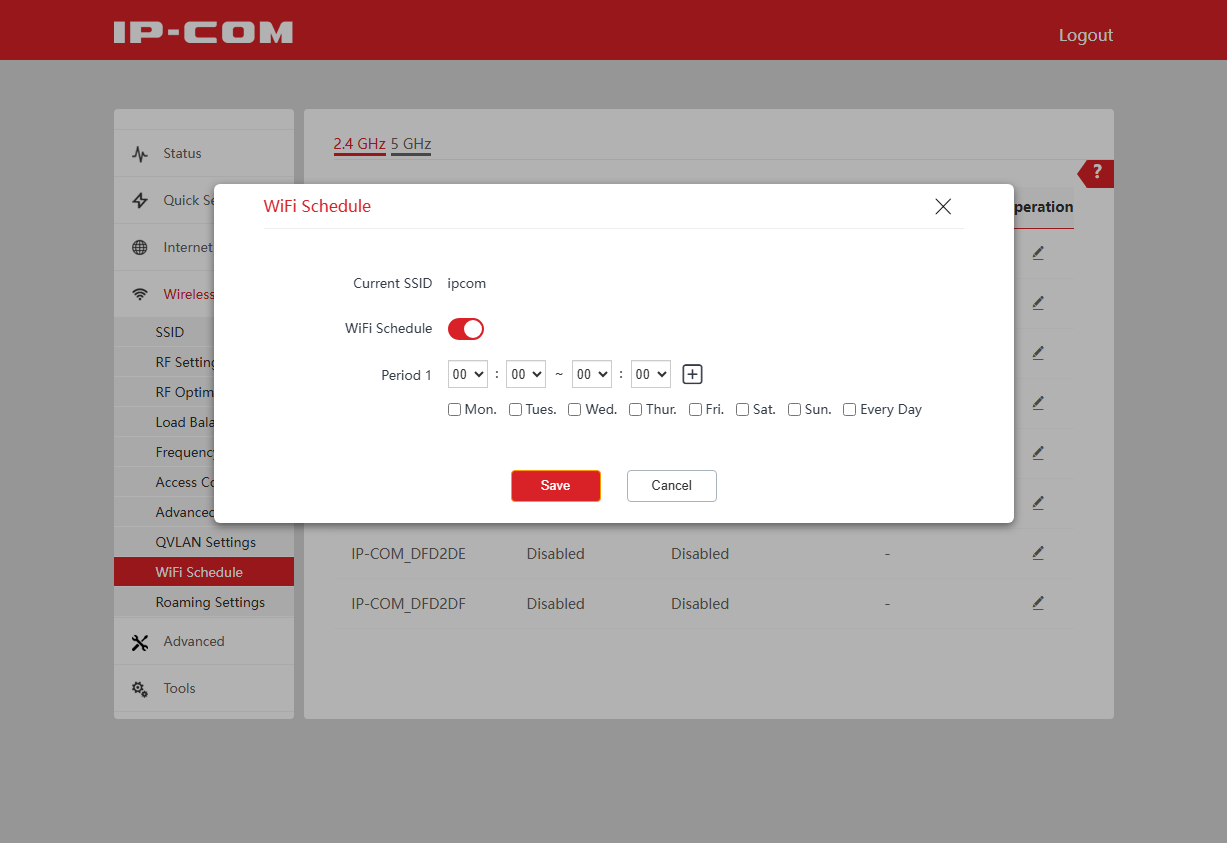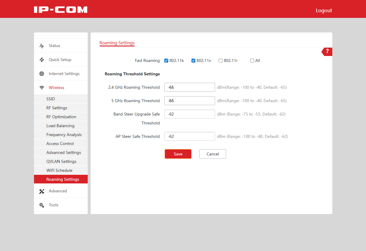 Для сегментирования сети, например для организации гостевого доступа, обычно используется технология VLAN. На странице QVLAN Settings можно назначить требуемые теги для настроенных ранее SSID. Страница WiFi Schedule позволяет для каждого SSID настроить расписание работы. Последний пункт в этом разделе — настройка параметров роуминга: протоколов 802.11k/v/r и порогов уровня сигнала.