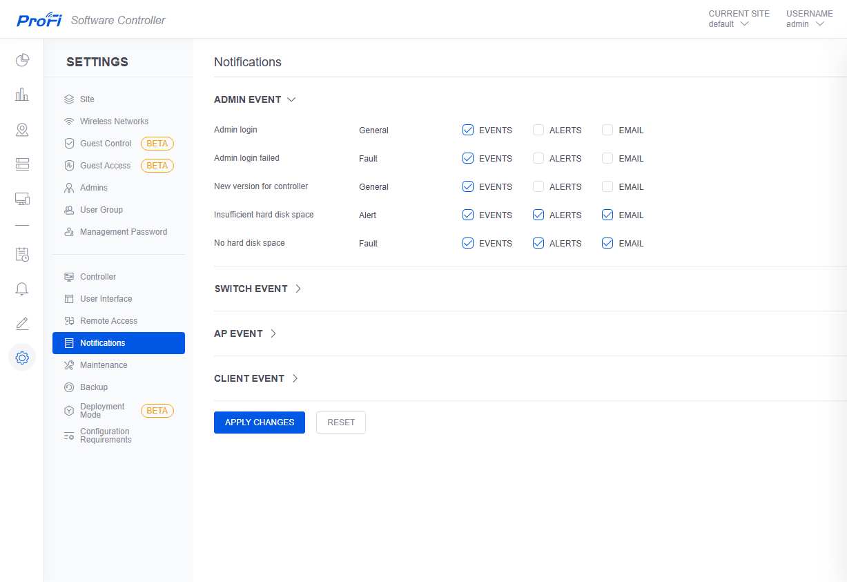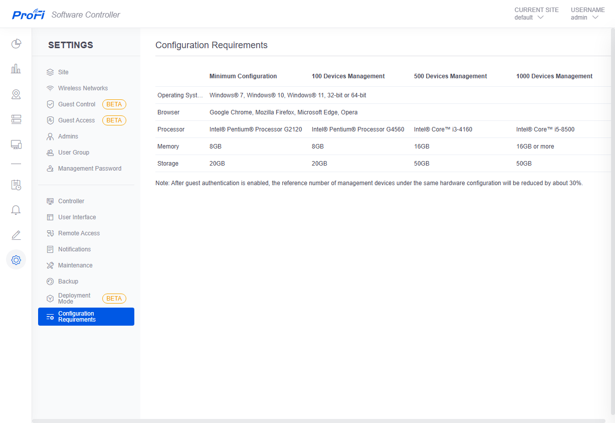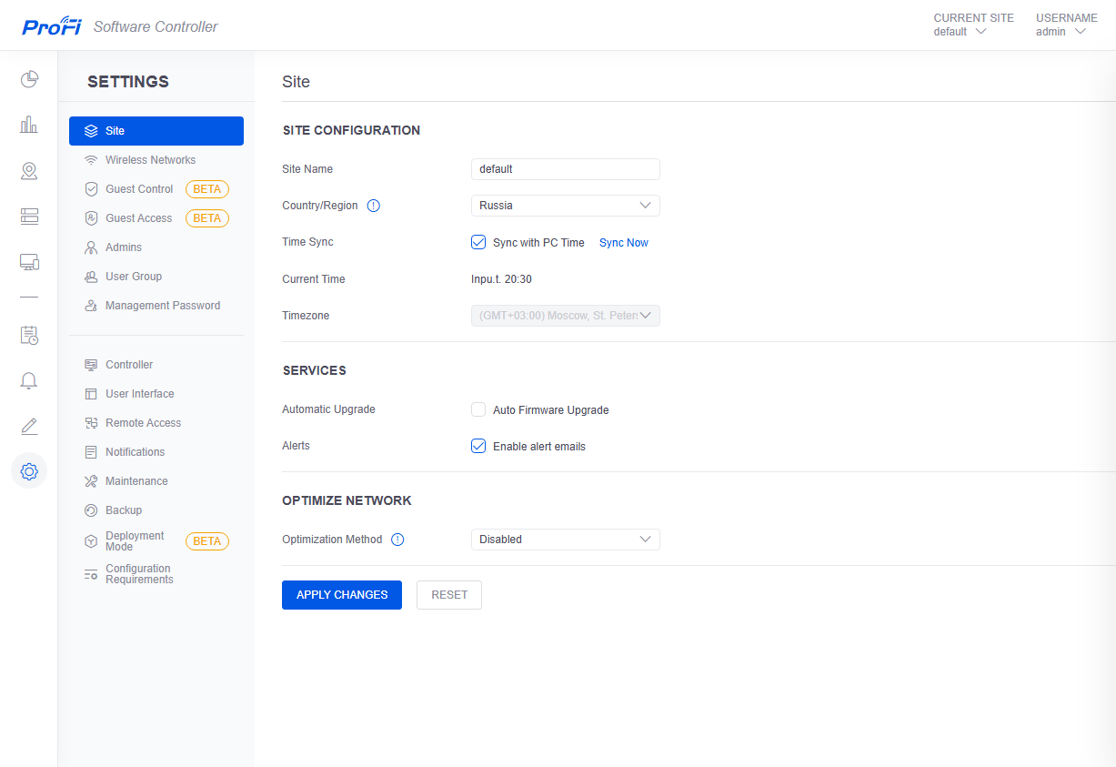 Предусмотрено создание нескольких независимых «сайтов», на которых можно разворачивать беспроводные сети, что может быть полезно для крупных компаний. Отметим, что можно использовать гостевые доступы со входом через портал или собственную встроенную базу аккаунтов. Есть функции обновления самого контроллера и прошивок точек доступа, создания и восстановления резервной копии базы контроллера.