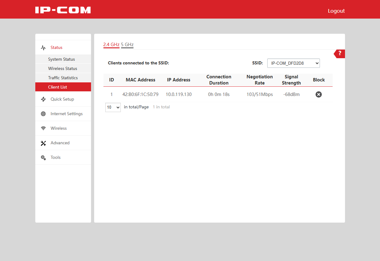 На странице Client List можно посмотреть всех подключенных клиентов с разбиением по диапазонам и SSID. В каждой записи присутствует информация о MAC- и IP-адресе, времени подключения, согласованных скоростей и уровне сигнала. Есть также кнопка для оперативной блокировки клиента.