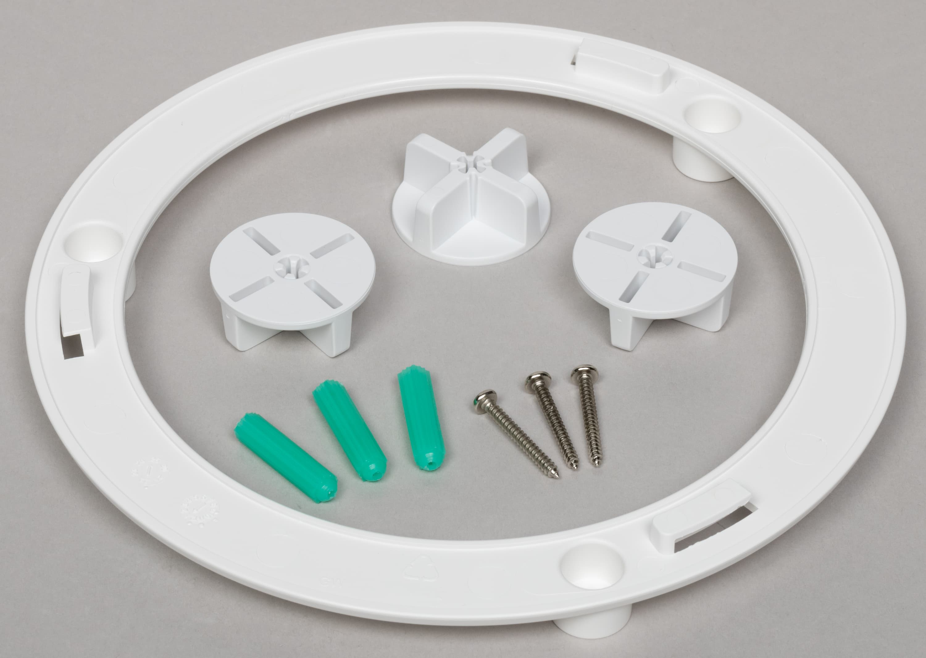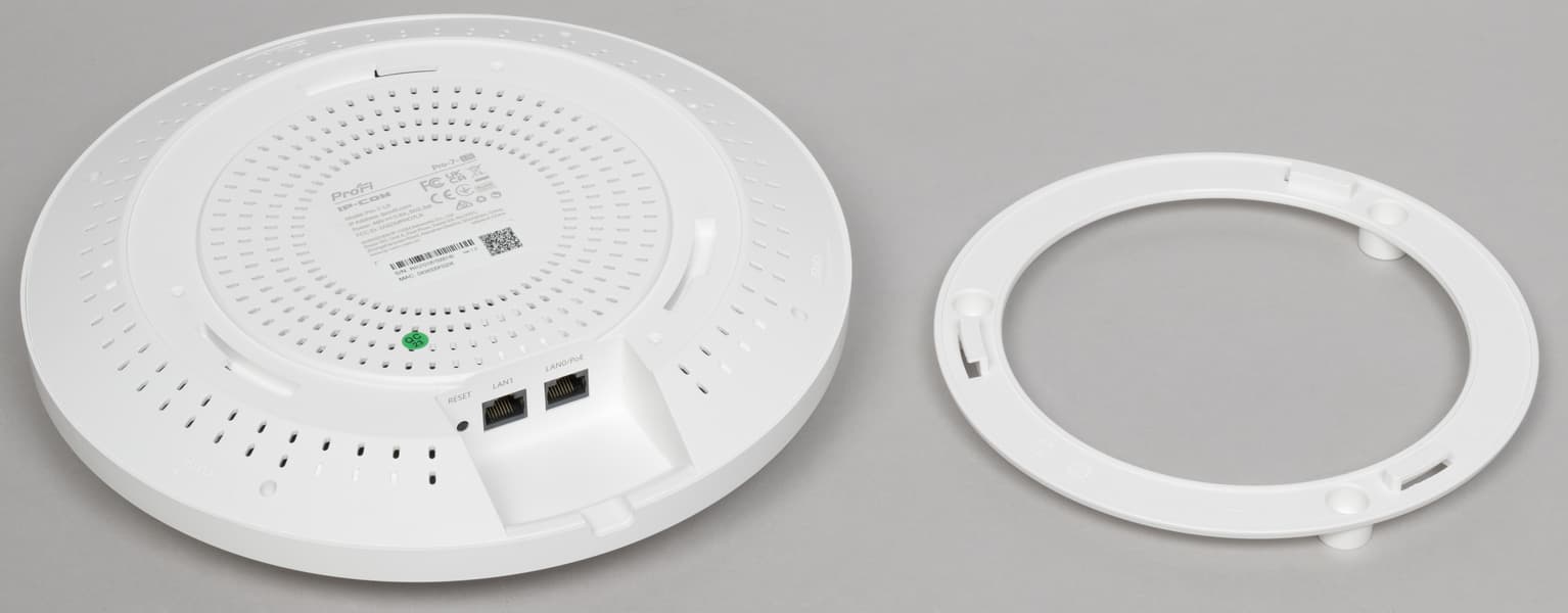 На самой точке доступа находится съемный элемент потолочного крепления — кольцо специальной формы из пластика. Оно устанавливается на полоток или стену с использованием комплектных дюбелей и шурупов, если поверхность твердая, или с шурупов и специальных «гаек» из пластика, если речь идет о подвесном потолке.