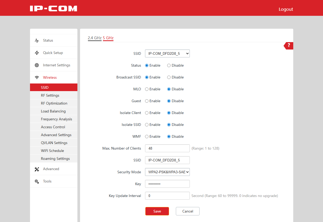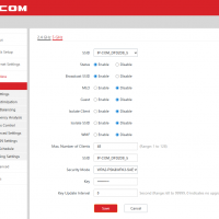 Раздел меню Wireless по понятным причинам наиболее многочисленный. На первой странице настраиваются SSID беспроводных сетей. В параметрах указываются имя, режим защиты, максимальное число клиентов и другие параметры. Отметим, что возможность авторизации клиентов через сервер RADIUS реализована только для WPA2.