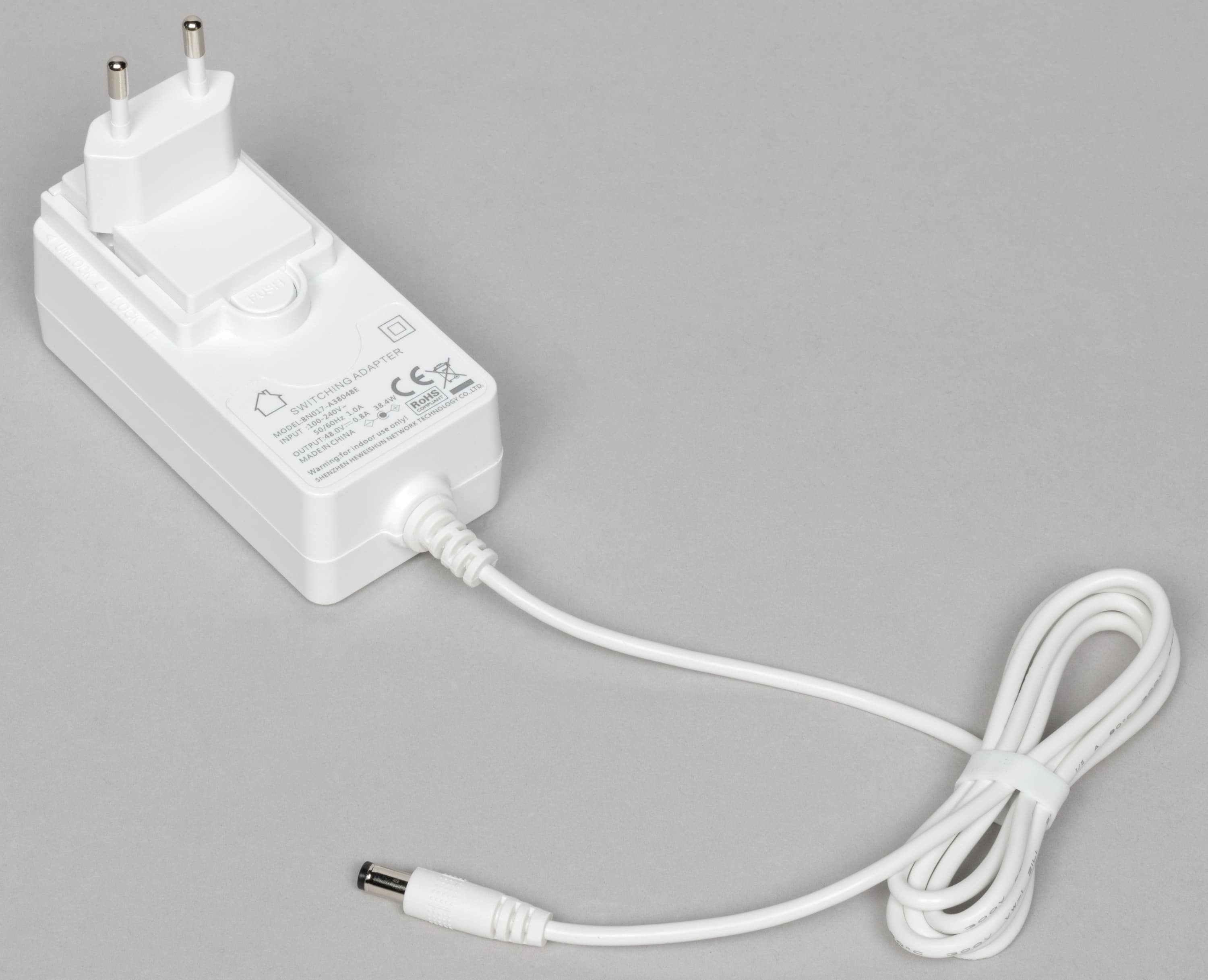Блок питания выполнен в формате для установки в розетку, он достаточно компактный, так что можно будет поставить и несколько рядом в блок розеток. Вилка у него сменная, в нашем случае в комплекте была только вилка только под отечественные розетки. Кабель достаточно гибкий, имеет длину 120 см и стандартный круглый штекер. Параметры блока питания — 48 В 0,8 А, что примерно в два раза превышает заявленное фактическое потребление точки доступа.
