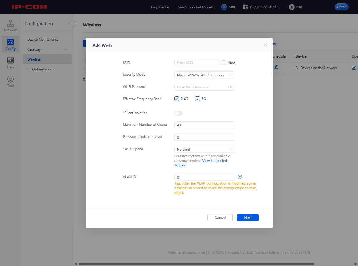 В диапазоне 2,4 ГГц точка доступа может обслуживать одновременно до 8 SSID. Для 5 ГГц эта цифра в два раза меньше — можно иметь максимально четыре независимых сети. Для разделения клиентов разных сегментов поддерживается VLAN. Это позволяет сегментировать беспроводную сеть согласно требованиям заказчика, например для организации отдельных сегментов для гостей или специализированного оборудования.