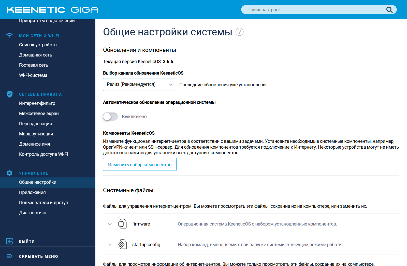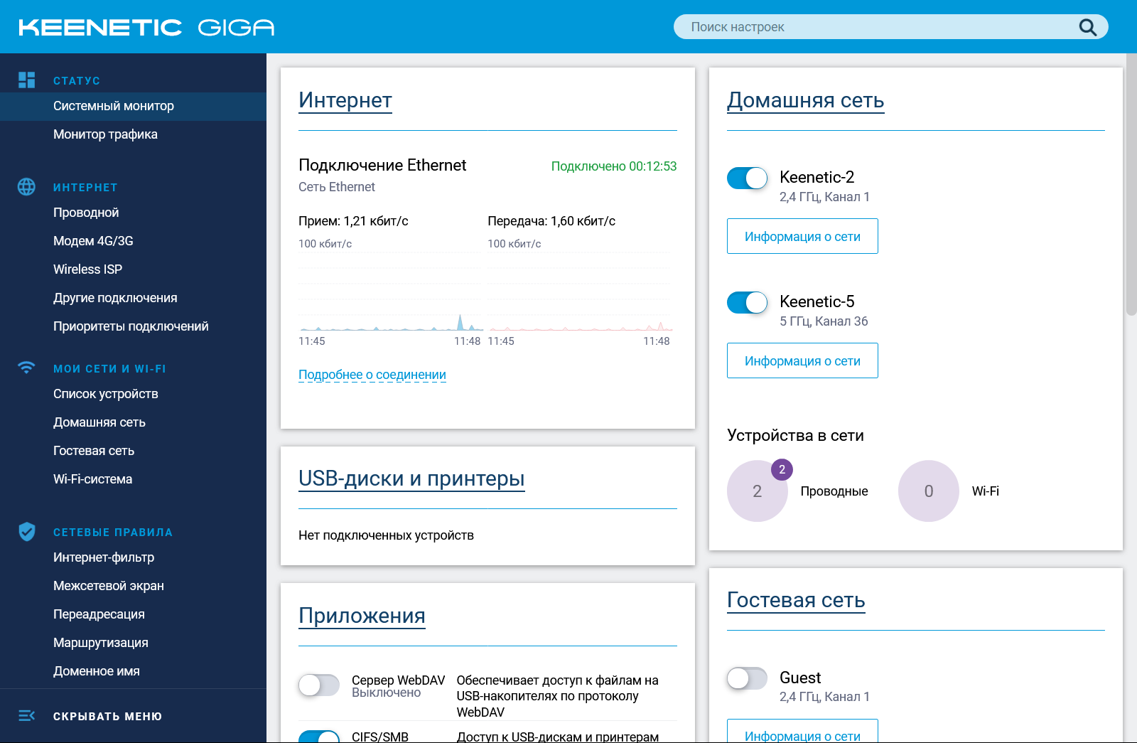 Поскольку мы уже не раз описывали встроенное программное обеспечения решений Keenetic, очень подробно рассказывать про него снова нет смысла. Так что пройдемся по этому вопросу коротко. Напомним, что все устройства бренда формально имеют одинаковый набор функций, а отличия могут быть связаны только с аппаратными особенностями. В частности, если у конкретной модели роутера отсутствуют порты USB, то и в прошивке соответствующие возможности не представлены. Второй момент: из-за модульной структуры прошивки обычно не получается задействовать одновременно много дополнительных сервисов у младших моделей с ограниченным объемом флеш-памяти. Так что если в ваших планах использовать роутер «на полную катушку», стоит обратить на это внимание при выборе модели.