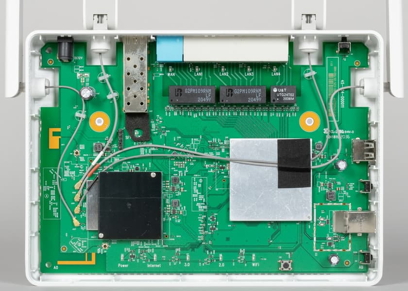 Радиоблок, как уже было понятно, изменился. Вместо микросхемы MediaTek MT7615DN теперь установлен чип MT7915D. Он тоже поддерживает работу двух независимых точек доступа в диапазонах 2,4 и 5 ГГц по конфигурации 2T2R, но уже с Wi-Fi 6. Так что в итоге пользователь с клиентами прошлых поколений получает скорости до 400 Мбит/с в 2,4 ГГц с 802.11n и до 867 Мбит/с в 5 ГГц с 802.11ac, а если у него есть устройства с поддержкой 802.11ax, то здесь уже максимальные скорости подключения составляют 574 и 1201 Мбит/с соответственно, что дает класс AX1800. Отметим, что использованный контроллер не поддерживает канал шириной 160 МГц.