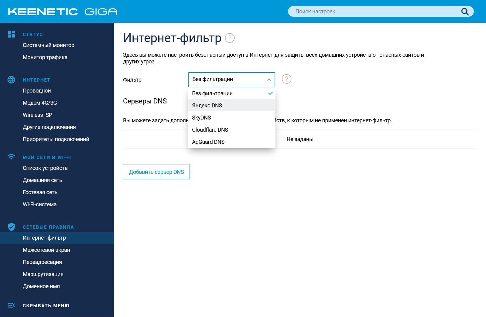 - интернет-фильтры на базе внешних сервисов (Яндекс.DNS, SkyDNS, Adguard DNS, Cloudflare DNS);