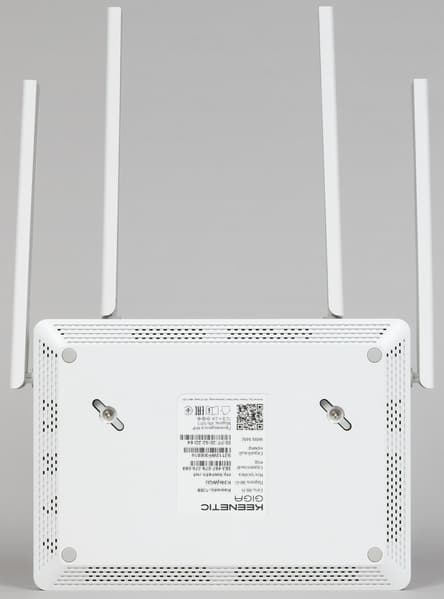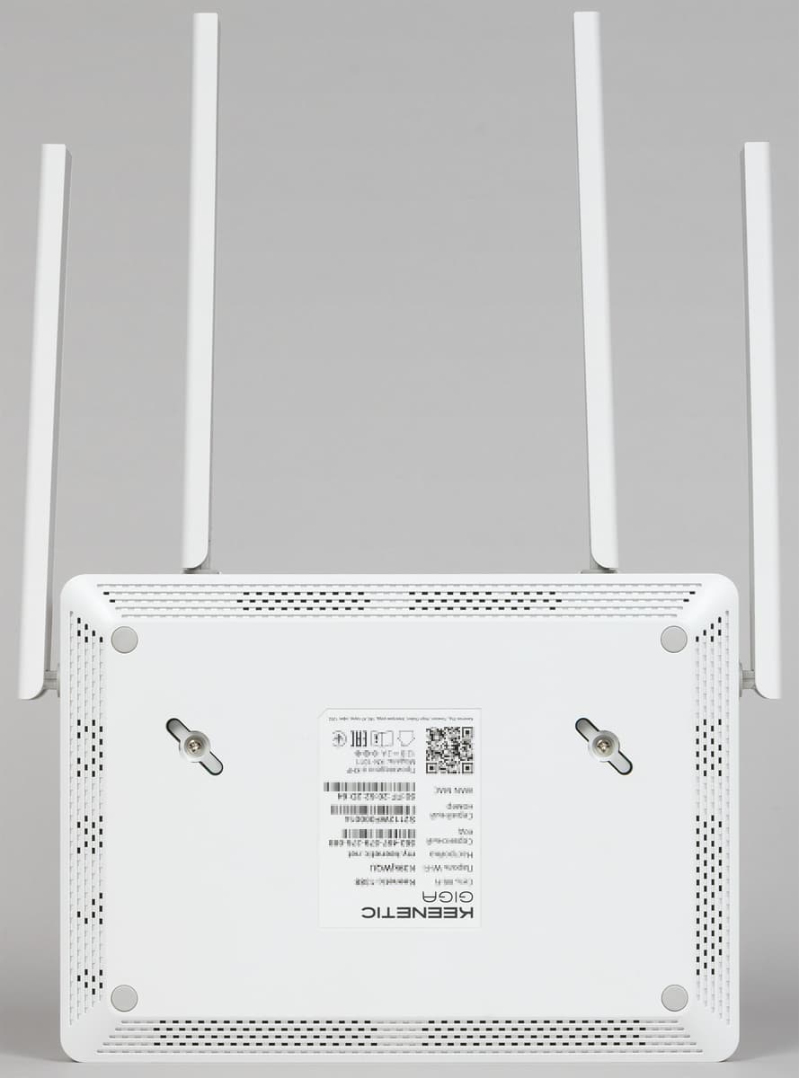 На свободных местах на левой и правой сторонах, а также на дне расположены решетки пассивной вентиляции. Кроме того, снизу мы видим информационную наклейку с данными для доступа к роутеру и беспроводным сетям. Напомним, что решения Keenetic с завода идут с уникальными именами и паролями для беспроводных подключений.
