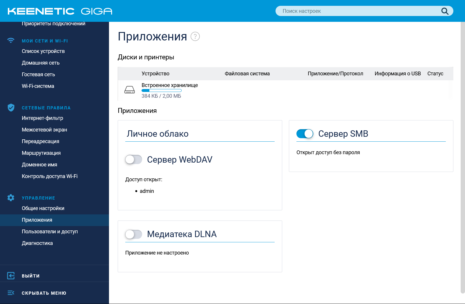 - доступ к USB-накопителям по SMB и WebDAV, организация медиасервера DLNA;