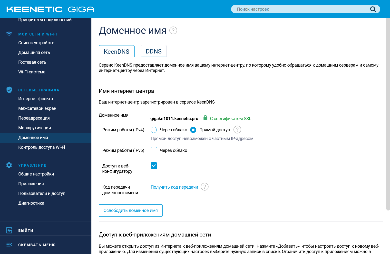 - сервис KeenDNS для удаленного безопасного (с официальным сертификатом SSL) подключения к роутеру и устройствам за ним даже при отсутствии «белого» адреса;