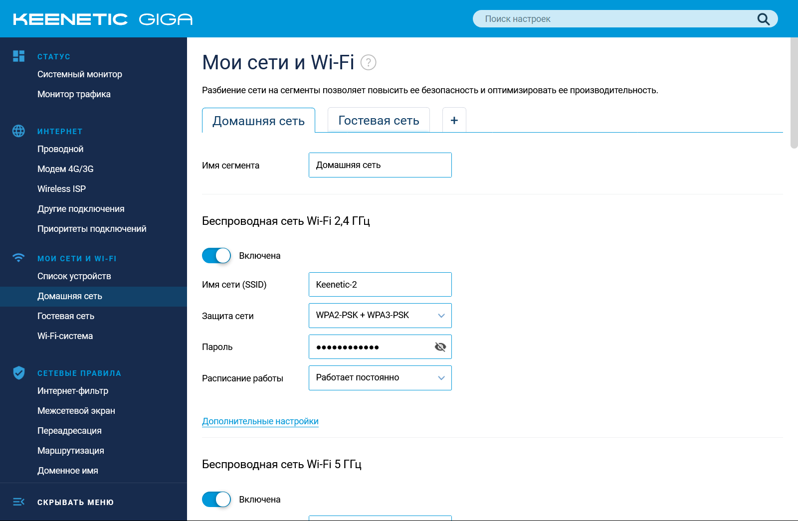 Настройки роутера минимальны — меняются имена сетей (для возможности принудительного выбора диапазона), фиксируется канал. С данной моделью мы также включили режим защиты WPA2-PSK/WPA3-PSK как более современный. При этом клиенты не имеющие поддержки третьей версии будут работать со второй.