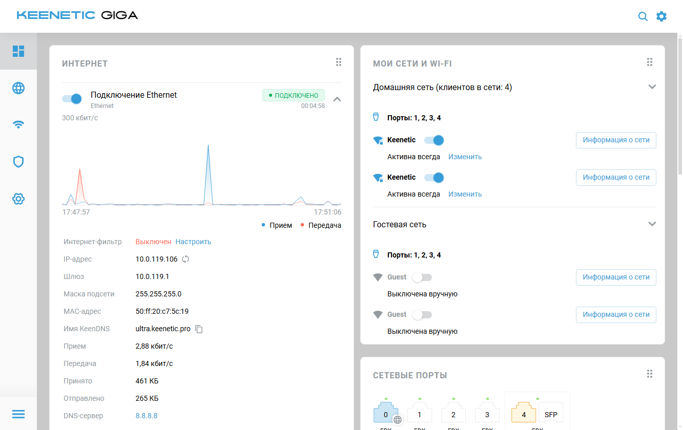 Набор сетевых портов здесь уникальный для Keenetic — четыре гигабитных порта и один порт 2,5 Гбит/с, который можно использовать или с медным кабелем, или с оптикой через соответствующий трансивер. В решениях этого производителя выбор роли портов — LAN или WAN, осуществляется в настройках, так что можно использовать любые комбинации. Но в некоторых случаях стоит учитывать особенности конфигурации для получения максимальной эффективности. В частности, «синий» гигабитный порт реализован напрямую в SoC, а остальные порты, включая порт 2,5 Гбит/с, работают через внешний коммутатор MT7531AE. Он обеспечивает, в том числе, поддержку VLAN и возможность агрегации портов 1 и 2. А вот знакомая по некоторым прошлым моделям функции диагностики сетевого кабеля в текущей прошивке у рассматриваемой есть только в порту 2,5 Гбит/с.