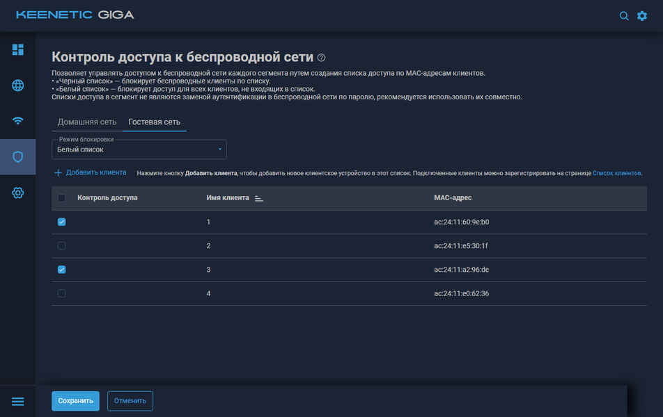 По традиции производитель реализовал и контроль доступа к беспроводной сети по MAC-адресам клиентов. Хотя, конечно, наличие в списках выбора проводных клиентов немного путает.