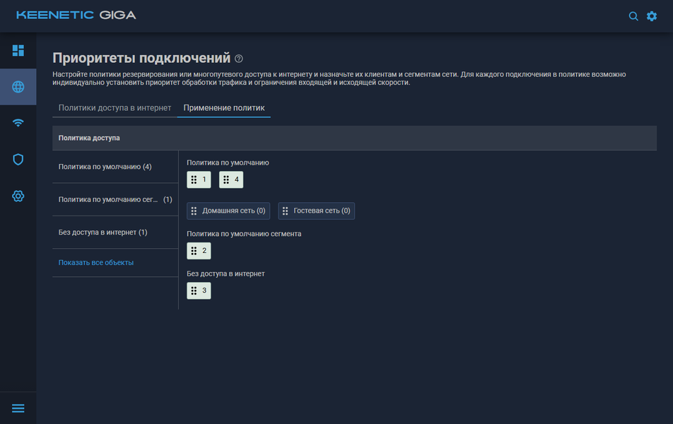 Предусмотрено использование политик для распределение клиентов локальной сети по провайдерам.