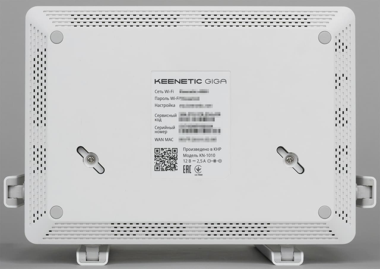 На боковых торцах и дне присутствуют решетки пассивной вентиляции. Заметим, что дно имеет скосы по краям, что должно повышать эффективность охлаждения электронной начинки. Опирается роутер на четыре небольшие резиновые ножки. Кроме того, предусмотрено крепление на стену в любом положении. Но вот понять, почему нельзя сделать расстояние между отверстиями кратным сантиметру — невозможно. В центре мы видим знакомую информационную наклейку с серийным номером, сервисным кодом, уникальным ключом беспроводной сети и другой информацией.
