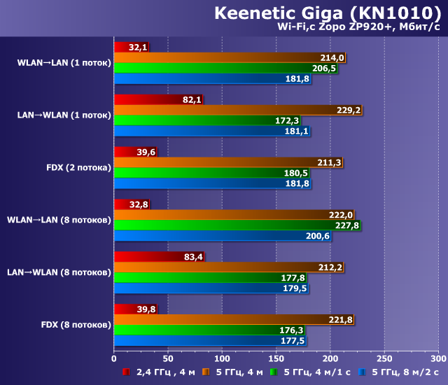 Как мы писали выше, по своим формальным техническим характеристикам, особенно в части беспроводных точек доступа, устройство нельзя назвать «самым-самым». Однако для массового рынка решение класса AC1300 без сомнения относится к верхнему сегменту. Как мы уже не раз говорили, характеристики подавляющего большинства клиентских устройств не превышают AC1200 (300+867), так что для них роутер не будет ограничивать скорость работы. Тестирование подтвердило, что реализация беспроводных точек доступа в Keenetic Giga заслуживает высокой оценки, что связано, в том числе, и с аппаратными особенностями. Причем порадовал не только режим 802.11ac, но и работа в диапазоне 2,4 ГГц. Конечно, сложно представить современного клиента только с 2,4 ГГц, но, тем не менее, приятно, что компания не забывает и про прошлые поколения оборудования.