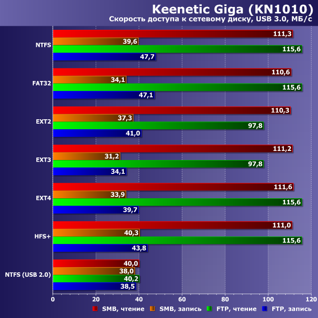 Роутер оборудован портами USB, так что сценарии хранения файлов можно назвать третьим популярным сценарием использования устройства. Для проверки скорости использовался накопитель SSD с адаптером на USB 3.0. Прошивка поддерживает работу со всеми распространенными файловыми системами. Доступ обычно предоставляется по протоколам SMB и FTP. Тестирование осуществлялось чтением и записью файла объемом около 4 ГБ. На файлах существенно меньшего размера цифры будут ниже.