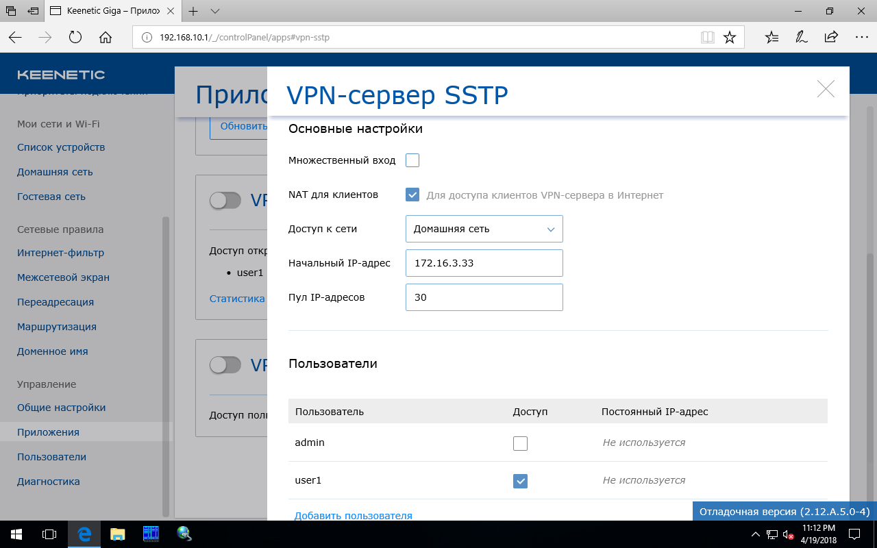 Вторая большая группа — серверы VPN. В дополнение к PPTP, L2TP/IPSec и OpenVPN, в данной отладочной версии прошивки реализованы сервер и клиент SSTP. Этот протокол является одним из вариантов для реализации сценария подключения VPN и при этом он работает через стандартные порты протокола HTTPS.