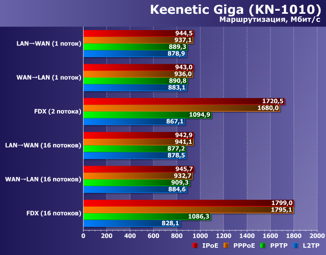 В тестировании основного сценария маршрутизации были некоторые замечания к стабильности в режиме PPTP, но сегодня он востребован мало, особенно на высокоскоростных тарифах, и для большинства пользователей это не существенно. Производительность устройства в этой задаче соответствует его уровню. Если не считать дуплекса в PPTP/L2TP, можно говорить о возможности эффективного использования модели с тарифными планами до 1 Гбит/с включительно.