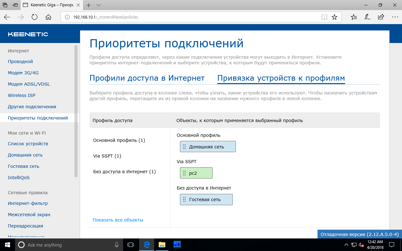 Одной из важных новых функций является поддержка профилей доступа к интернету (policy routing). В случае использования нескольких подключений к интернету, например с применением технологий VPN, можно в дальнейшем распределить клиентов локальной сети между ними.
