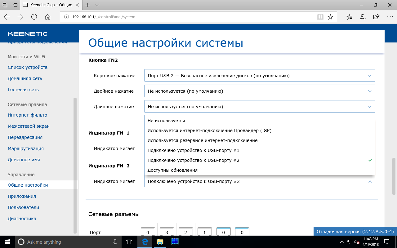 Здесь же активируется режим автоматического обновления прошивки, можно управлять системными файлами (например, сделать резервную копию настроек или текущей прошивки с учетом выбранных вами модулей), включить облачный сервис, настроить сетевое имя и часы, изменить назначение аппаратных кнопок (по три действия на каждую), выбрать функцию индикаторов на кнопках (например, они могут показывать активность резервного подключения или наличие обновления прошивки), настроить режимы проводных портов и порта USB. Ну и конечно есть кнопки перезагрузки роутера и возврата к заводским настройкам.