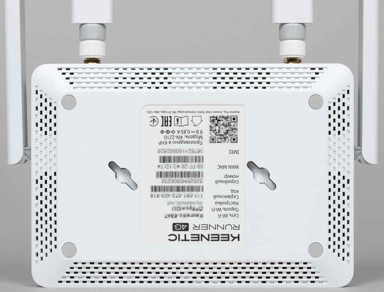 Остальная часть корпуса тоже матовая, но уже белая. На дне есть как резиновые ножки, так и специальные отверстия для настенного крепления (в любом варианте ориентации антенн).