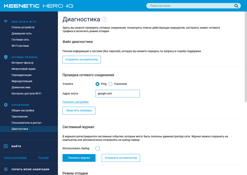 Несмотря на то, что роутеры Keenetic отличаются стабильной работой, в некоторых ситуациях все-таки может потребоваться проведение дополнительной диагностики. В прошивке предусмотрены сбор файла отчета для отправки в техподдержку, утилиты ping и traceroute, просмотр и скачивание журнала событий, специальный режим отладки подключения к провайдеру, записывающий в журнал более подробные данные об этом процессе.