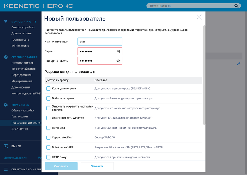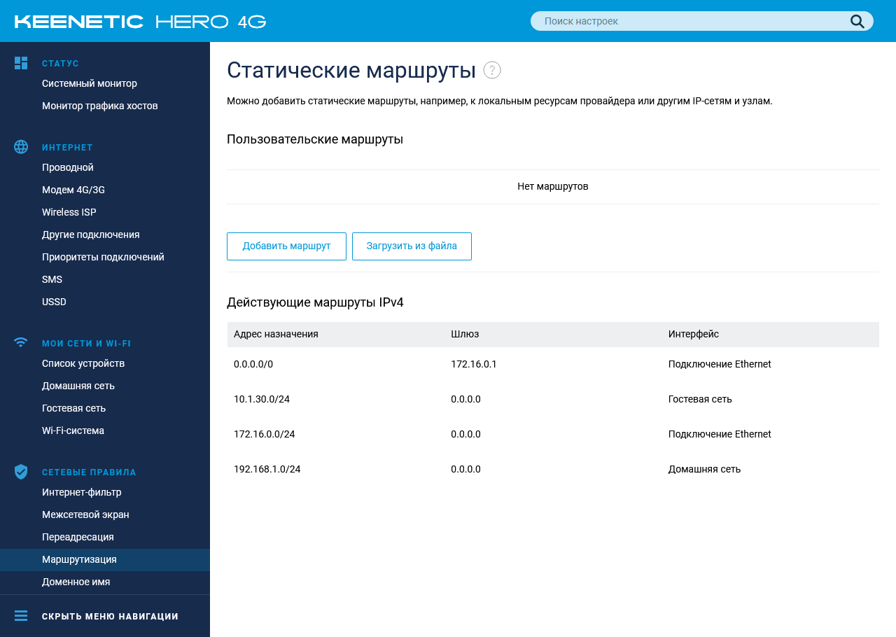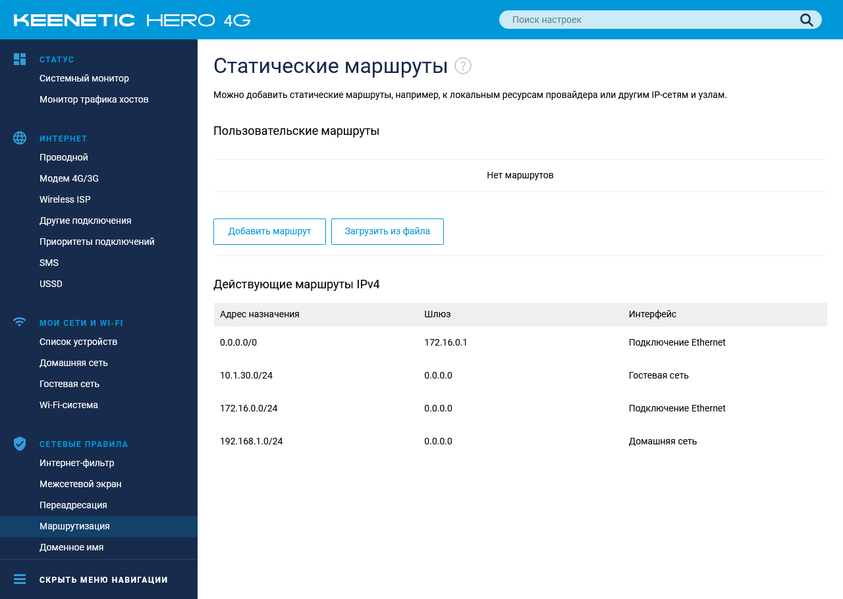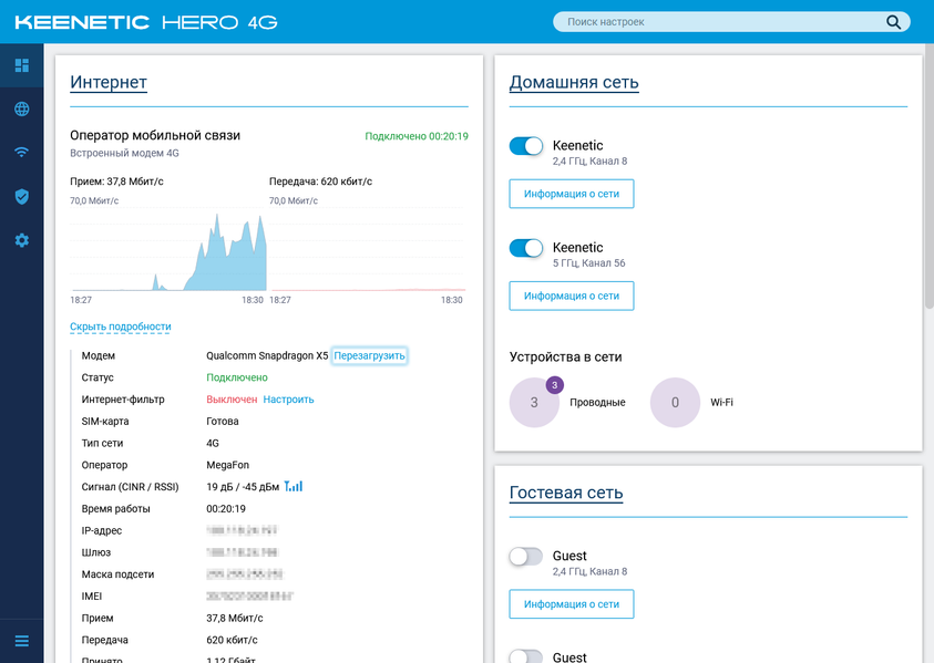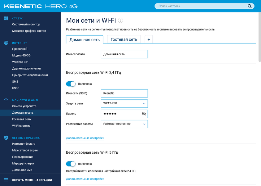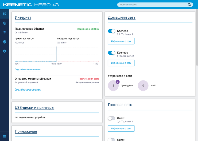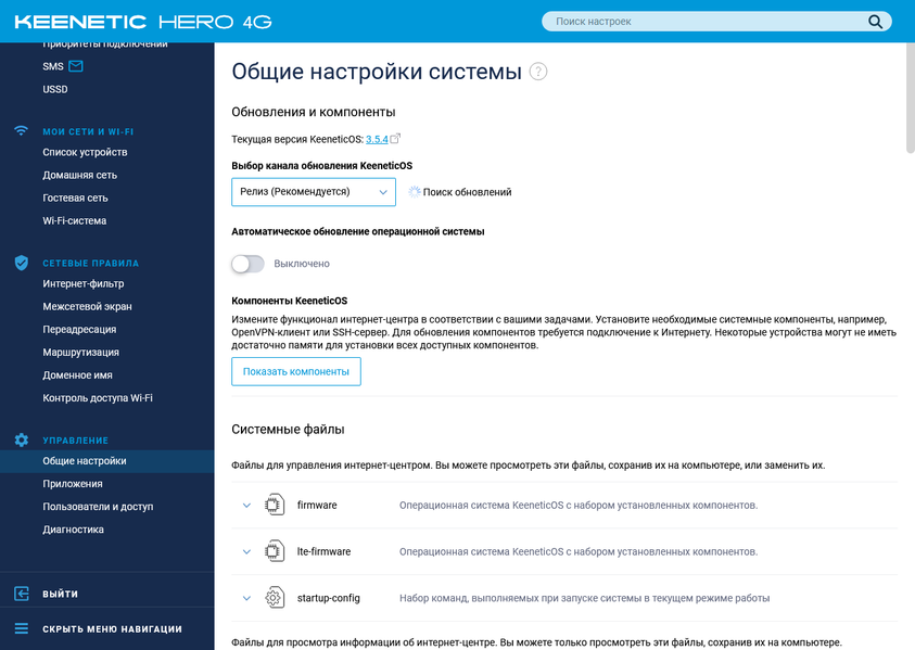 Коротко пройдемся по возможностям текущей версии прошивки на примере Keenetic Hero 4G. Младшая модель будет отличаться отсутствием настроек, связанных с USB и вторым радиомодулем.