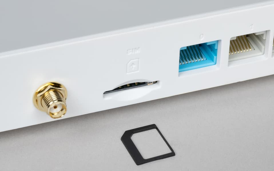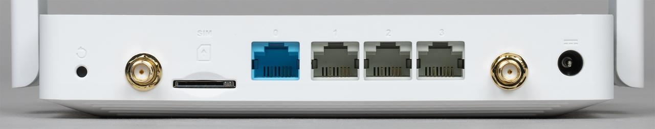 На задней стороне находятся скрытая кнопка сброса, вход блока питания, разъемы SMA для двух антенн сотового модема, слот для SIM-карты, порты проводной сети (четыре 100-мегабитных у младшей модели и пять гигабитных у старшей, последние имеют встроенные индикаторы подключения/активности).