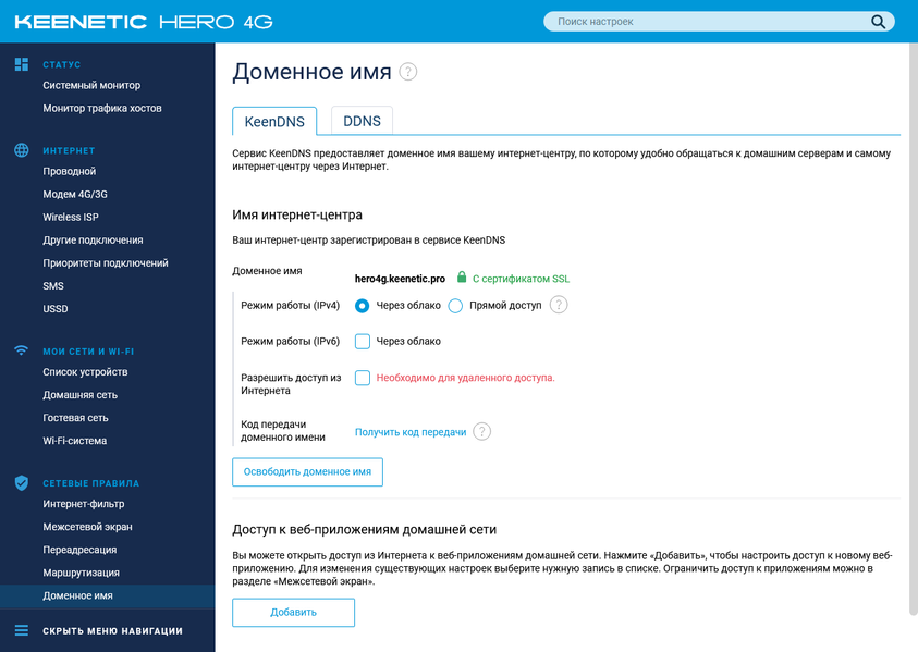 Важную роль в устройстве и дополнительных сервисах играет доменное имя. Кроме стандартного клиента DDNS с поддержкой нескольких провайдеров и пользовательского режима, в роутерах данного бренда реализована уникальная технология KeenDNS. Она совмещает в себе функции DDNS, автоматической защиты соединения с использованием официального сертификата SSL, облачного доступа при «сером» адресе от провайдера. Причем последняя функция не только работает для самого роутера, но и может быть использована для произвольных веб-сервисов на устройствах локальной сети. Все это очень просто настраивается и полностью бесплатно (если не считать покупки роутера, конечно).