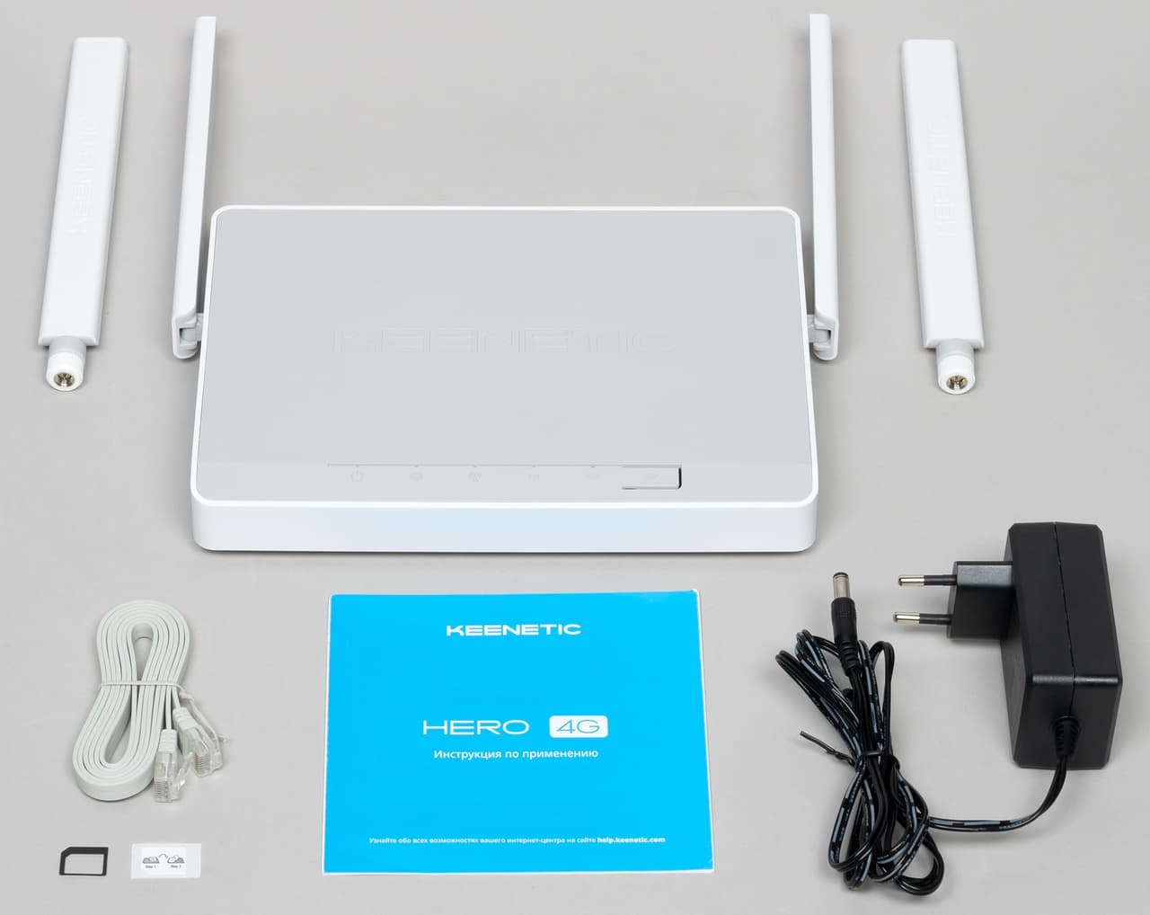 В комплект поставки в дополнение к роутеру, блоку питания (9 В 0,85 А для Runner 4G и 12 В 2 А для Hero 4G, кабель на полтора метра, стандартный круглый разъем), патч-корду (1,2 метра) и инструкции в данном случае входят съемные антенны для сотового модема и адаптер для SIM-карт. Патч-корды «плоского» формата и белого цвета, а вот блоки питания все так же черные. Видимо, объемы заказов не настолько велики, чтобы обеспечить правильную стоимость для белых вариантов. Хотя учитывая наличие встроенного сотового модема, в данном случае более важно качество БП, чем его внешний вид.
