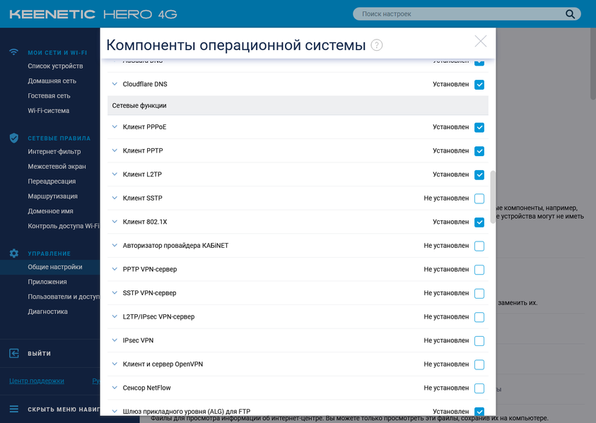 Перечислять все существующие пакеты нет особого смысла. Для Keenetic Hero 4G их более полусотни, для Runner 4G заметно меньше, поскольку у него отсутствует порт USB.