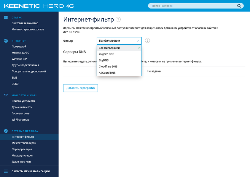Для защиты с использованием фильтрации DNS поддерживаются сервисы Яндекс.DNS, SkyDNS, Cloudlfare DNS и AdGuard DNS.