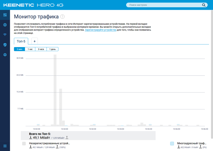 Относительно недавно в интерфейсе появилась страница мониторинга трафика хостов. Устройство собирает статистику по своим клиентам, так что вы сможете посмотреть, кто больше всего скачал. При этом предусмотрены разные временны́е интервалы — от трех минут до одного дня.